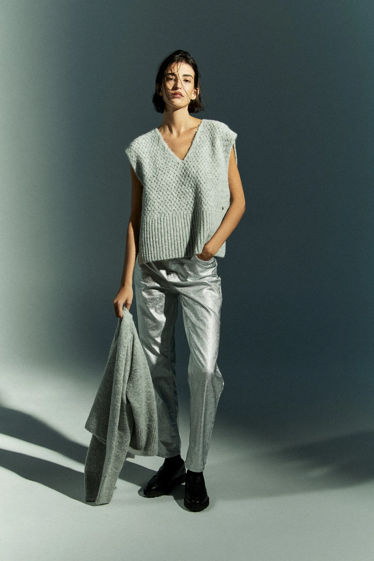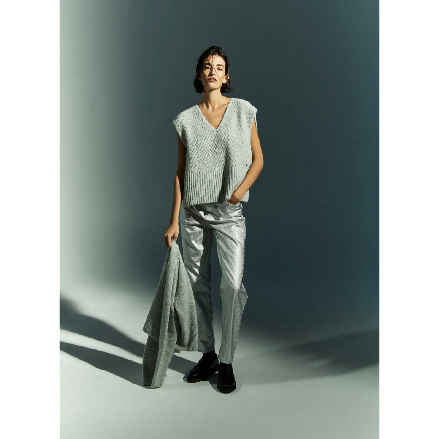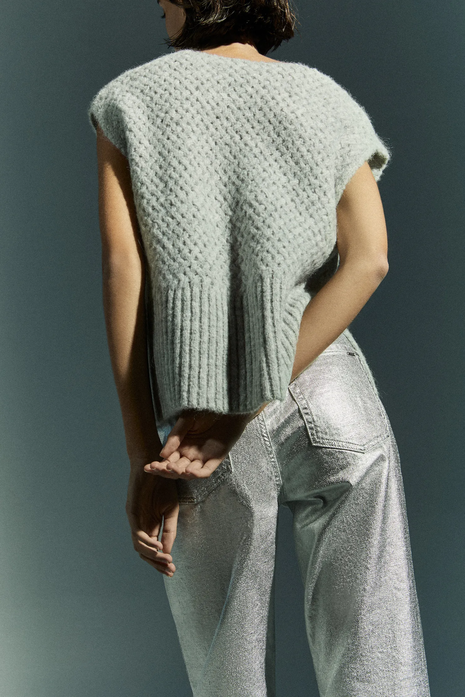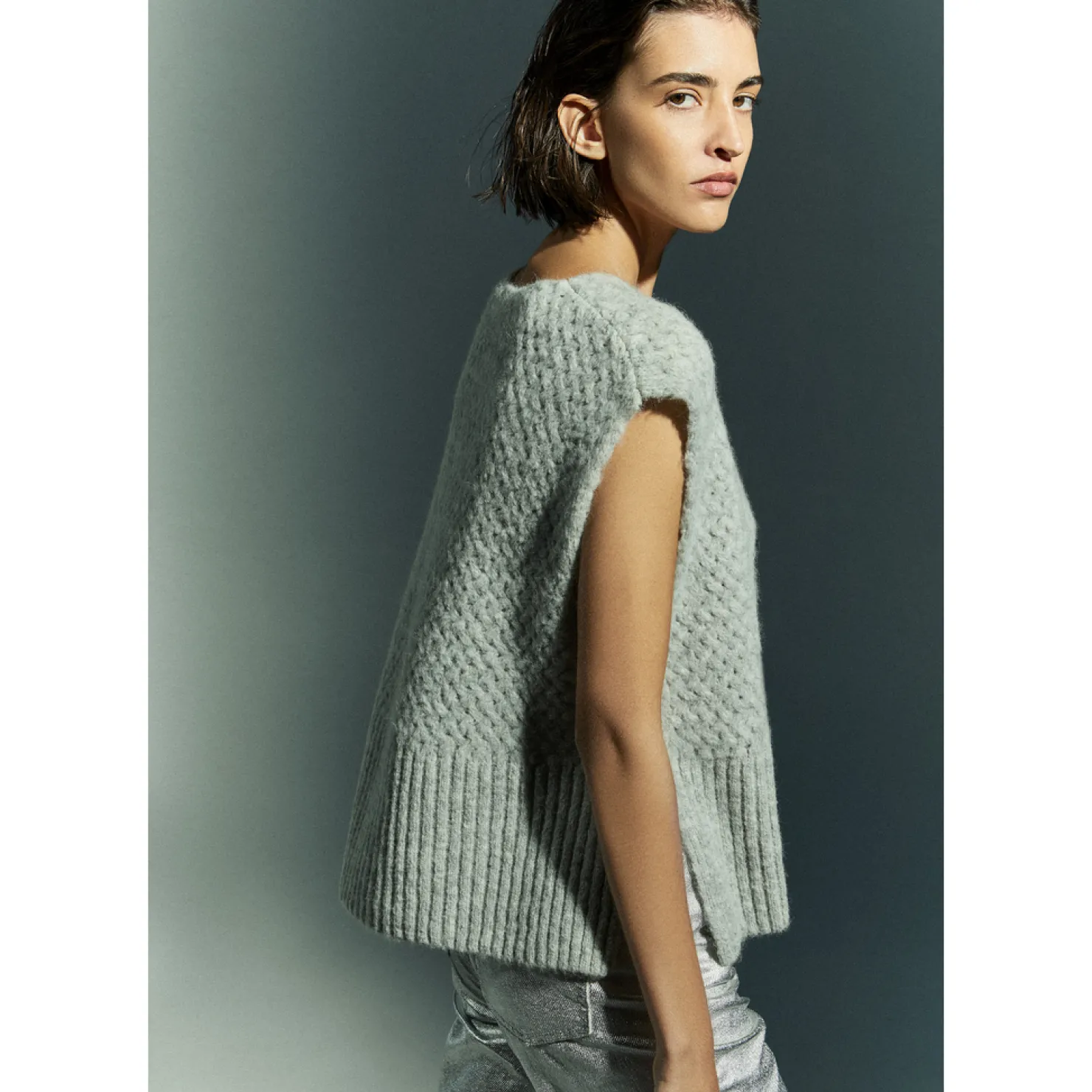 Grofgebreide debardeurV-halsGeribbelde boordZijsplitjes onderaan de zoom
