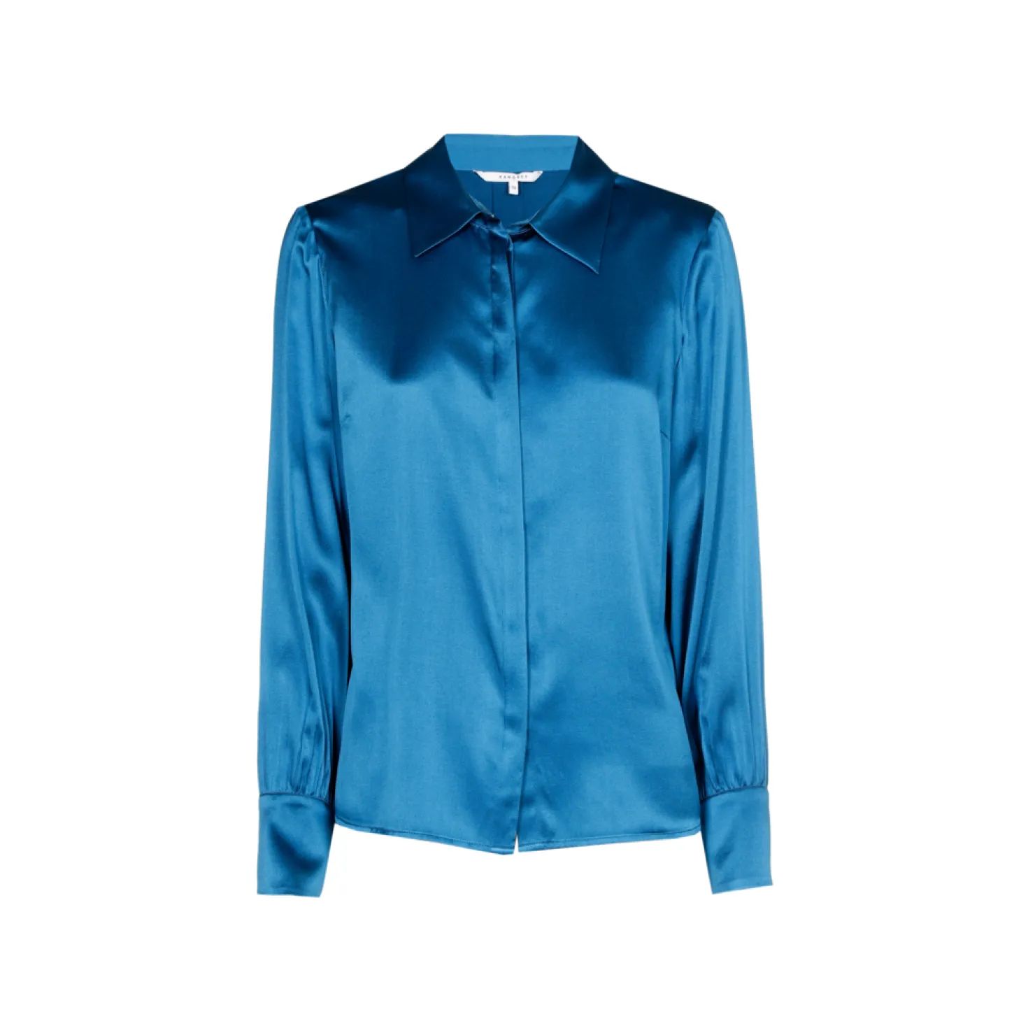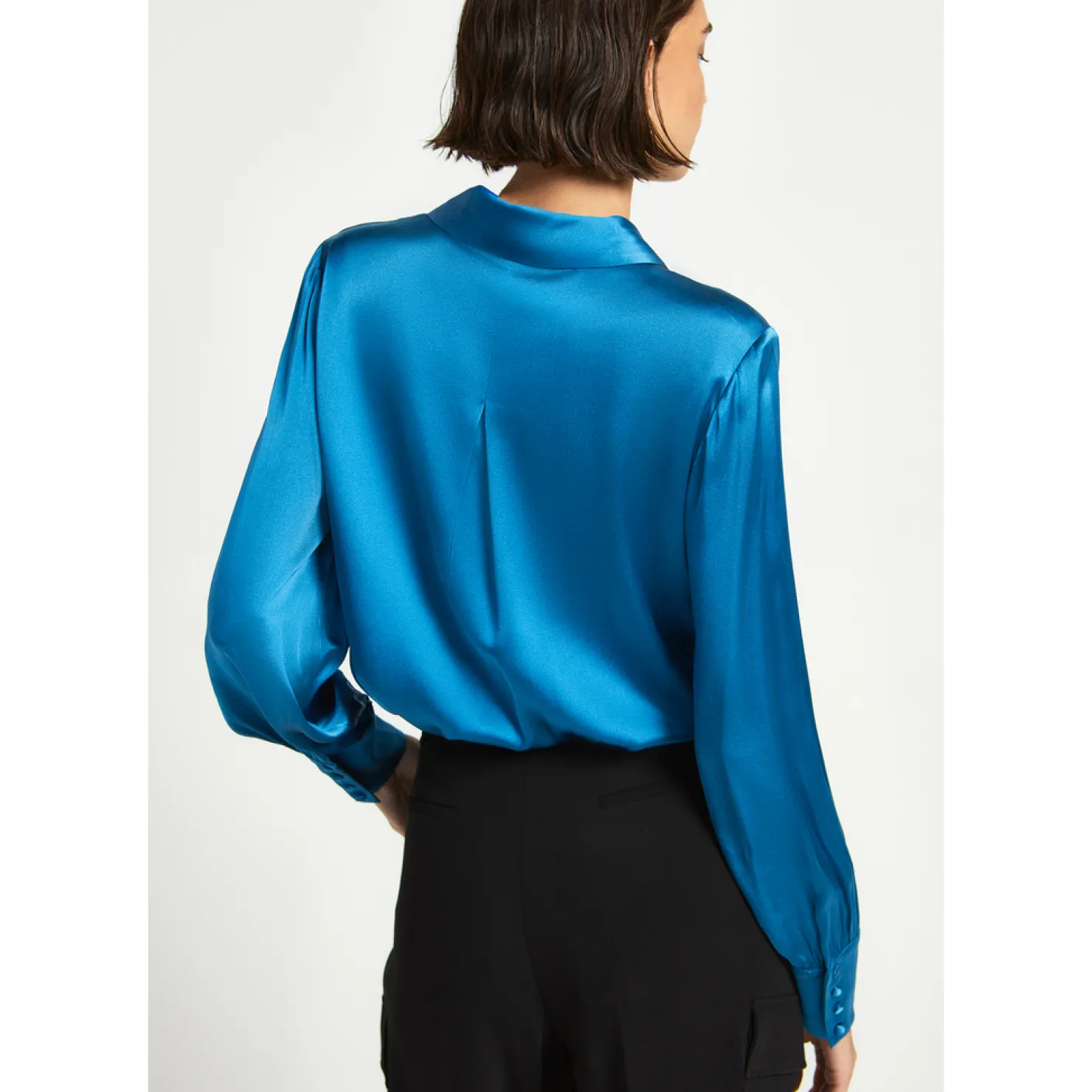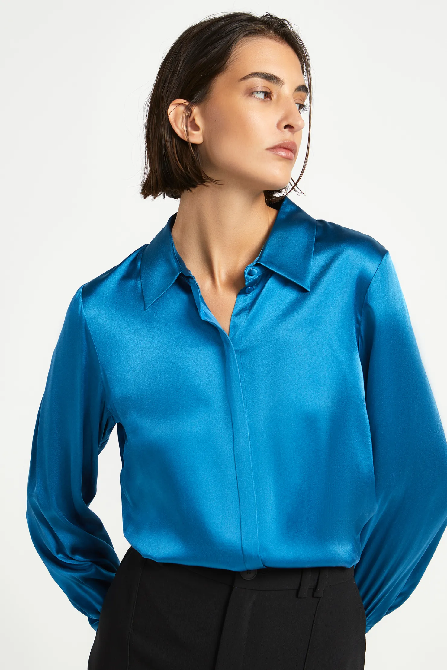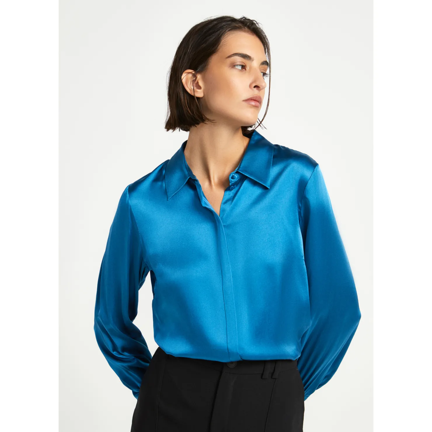 Klassieke pasvorm met borstneepje Verborgen knopenrij op het voorpand Hoge cuff met overtrokken knopen Fluïde stof en …