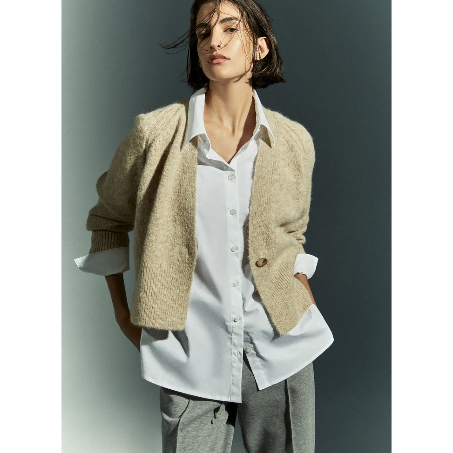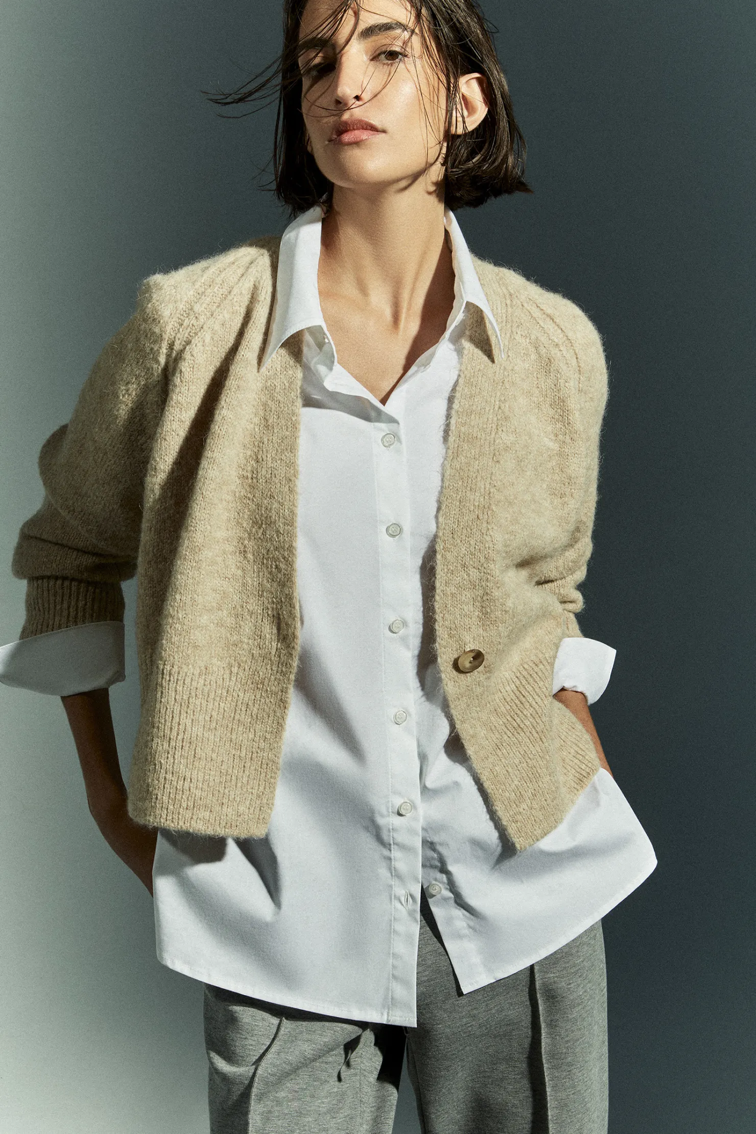 Geribbelde zoom, kraag en cuffsStijlvolle sierstiksels aan de schoudersDiepe V-hals met knoopsluiting