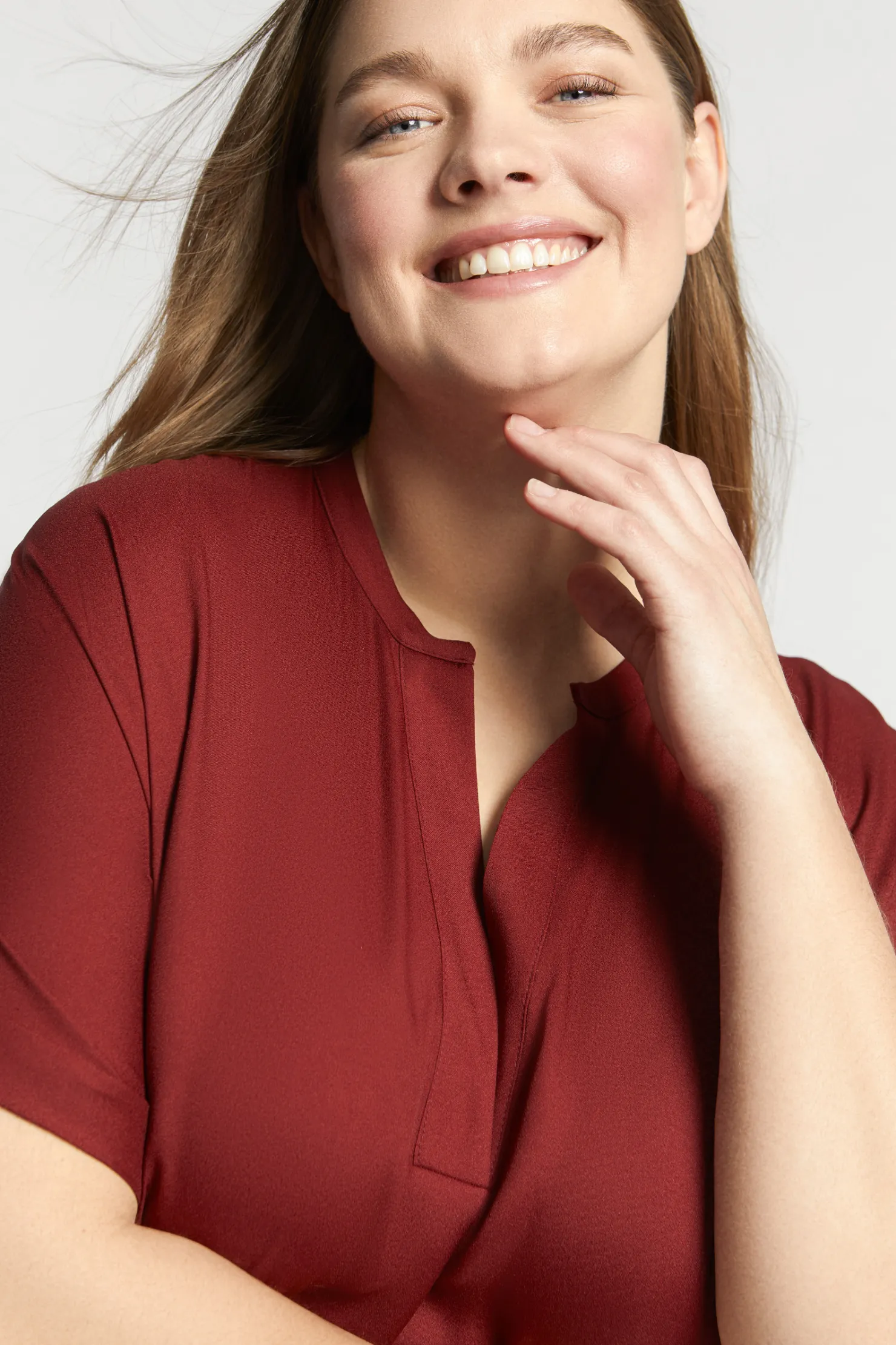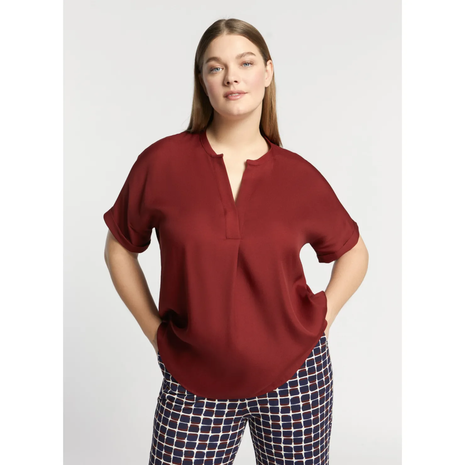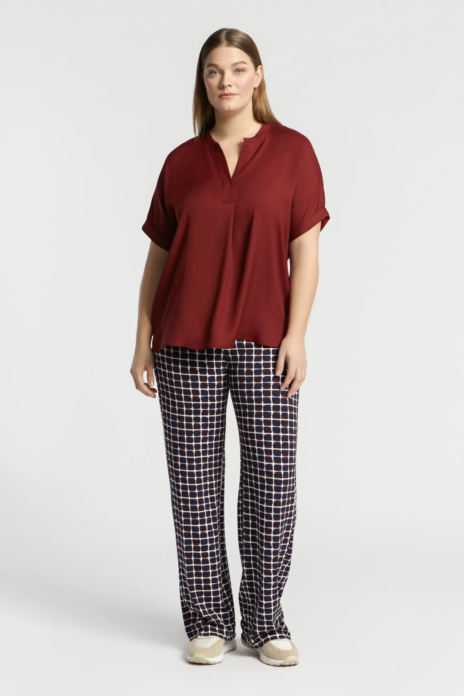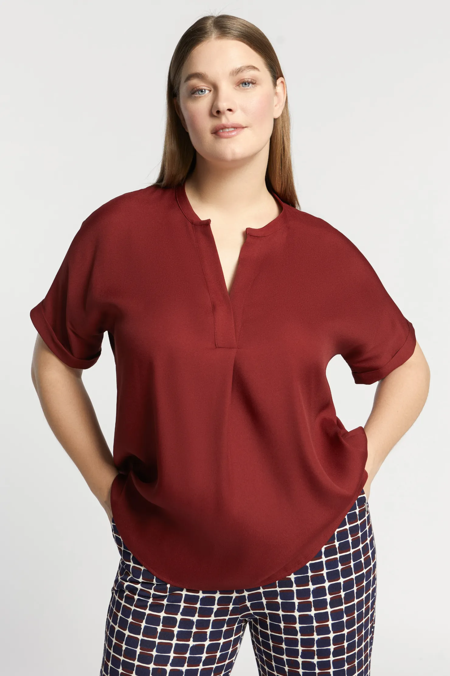 Ronde hals met split Licht glanzende stof Splitje aan de zijnaad Korte mouwen met omslag