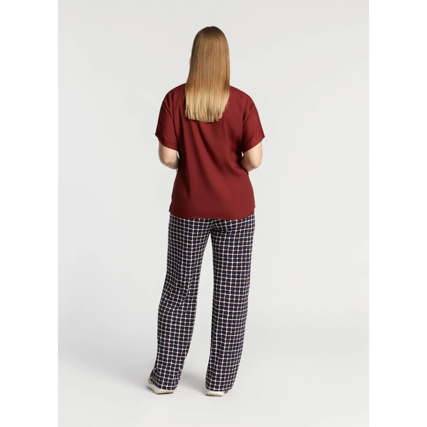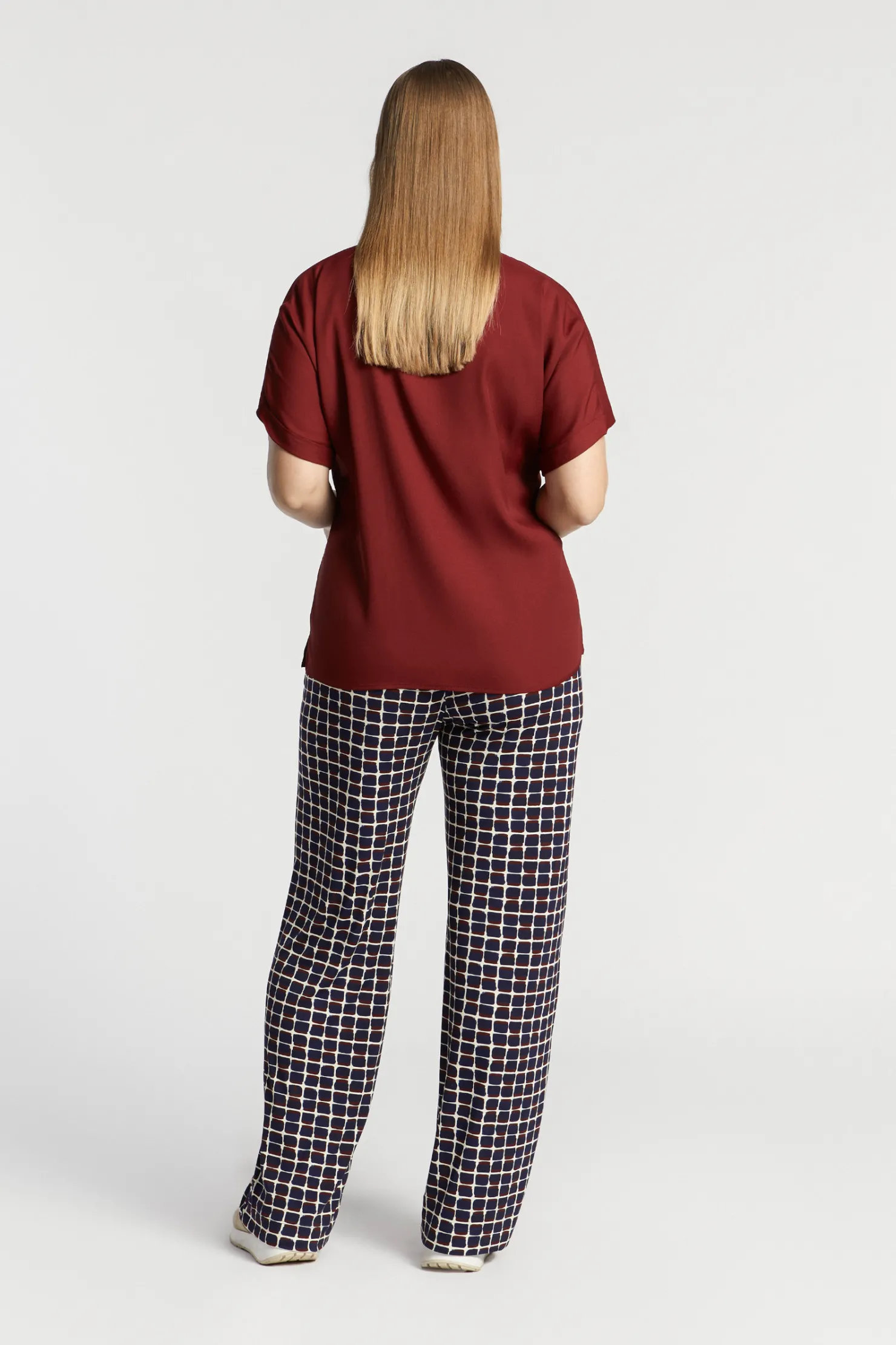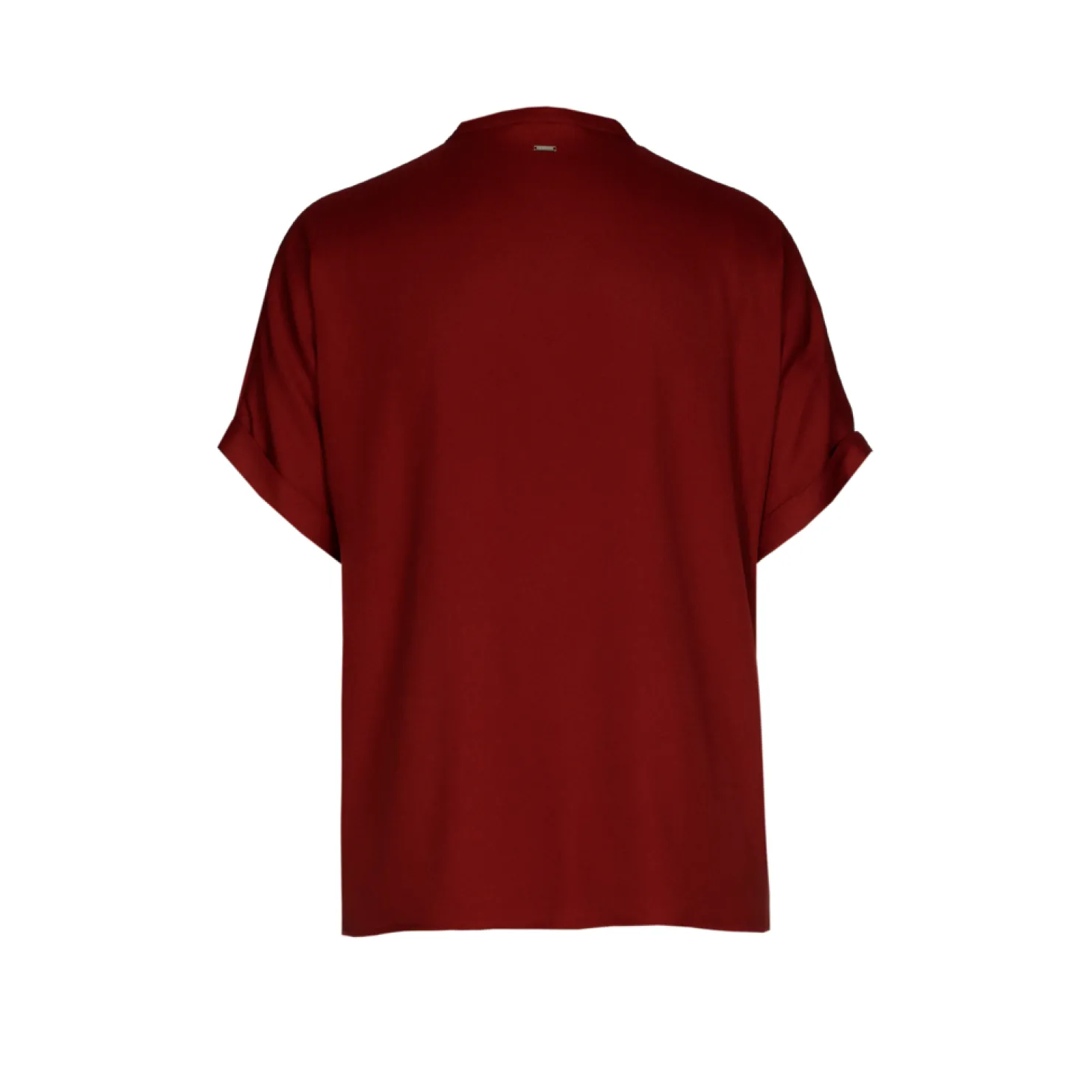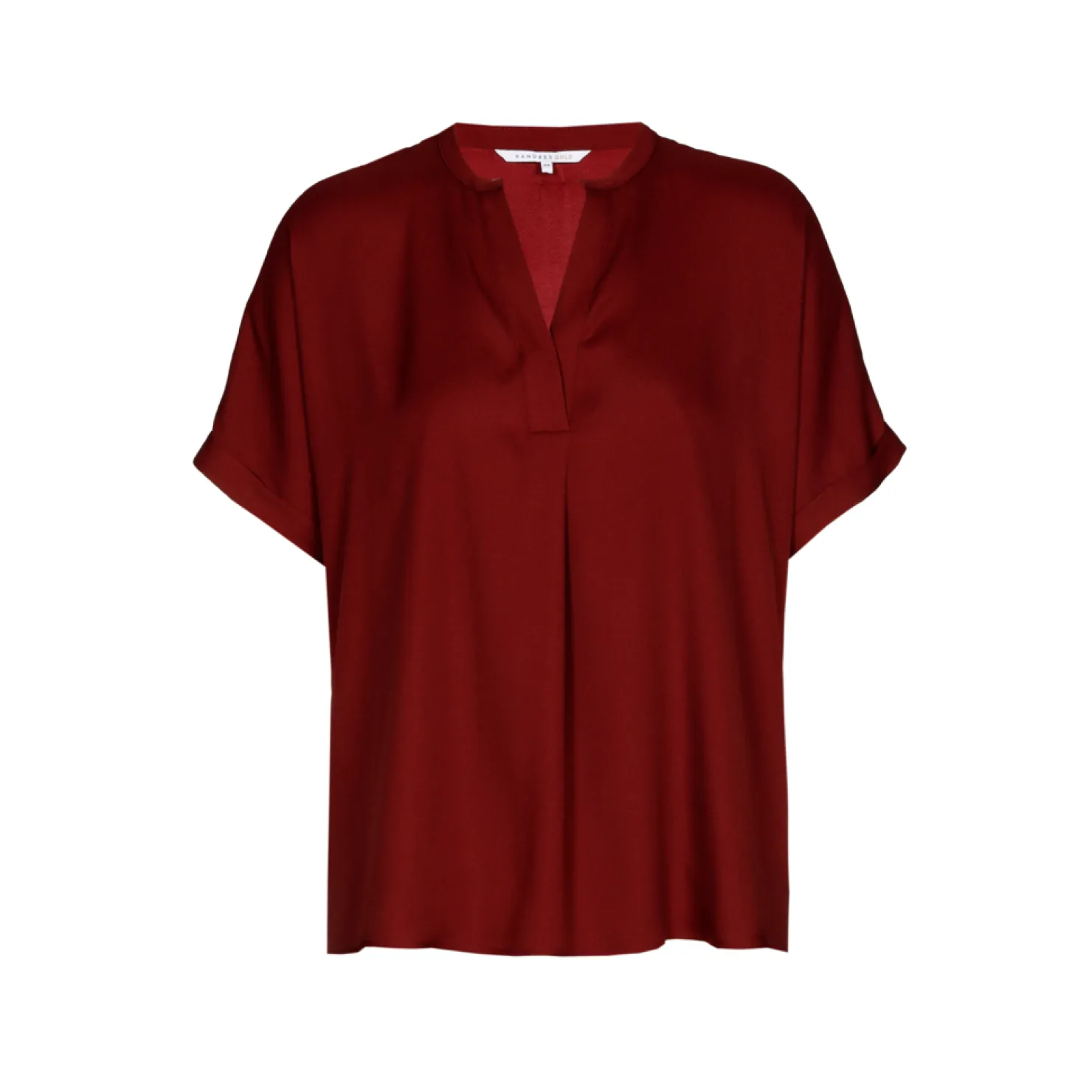 Ronde hals met split Licht glanzende stof Splitje aan de zijnaad Korte mouwen met omslag