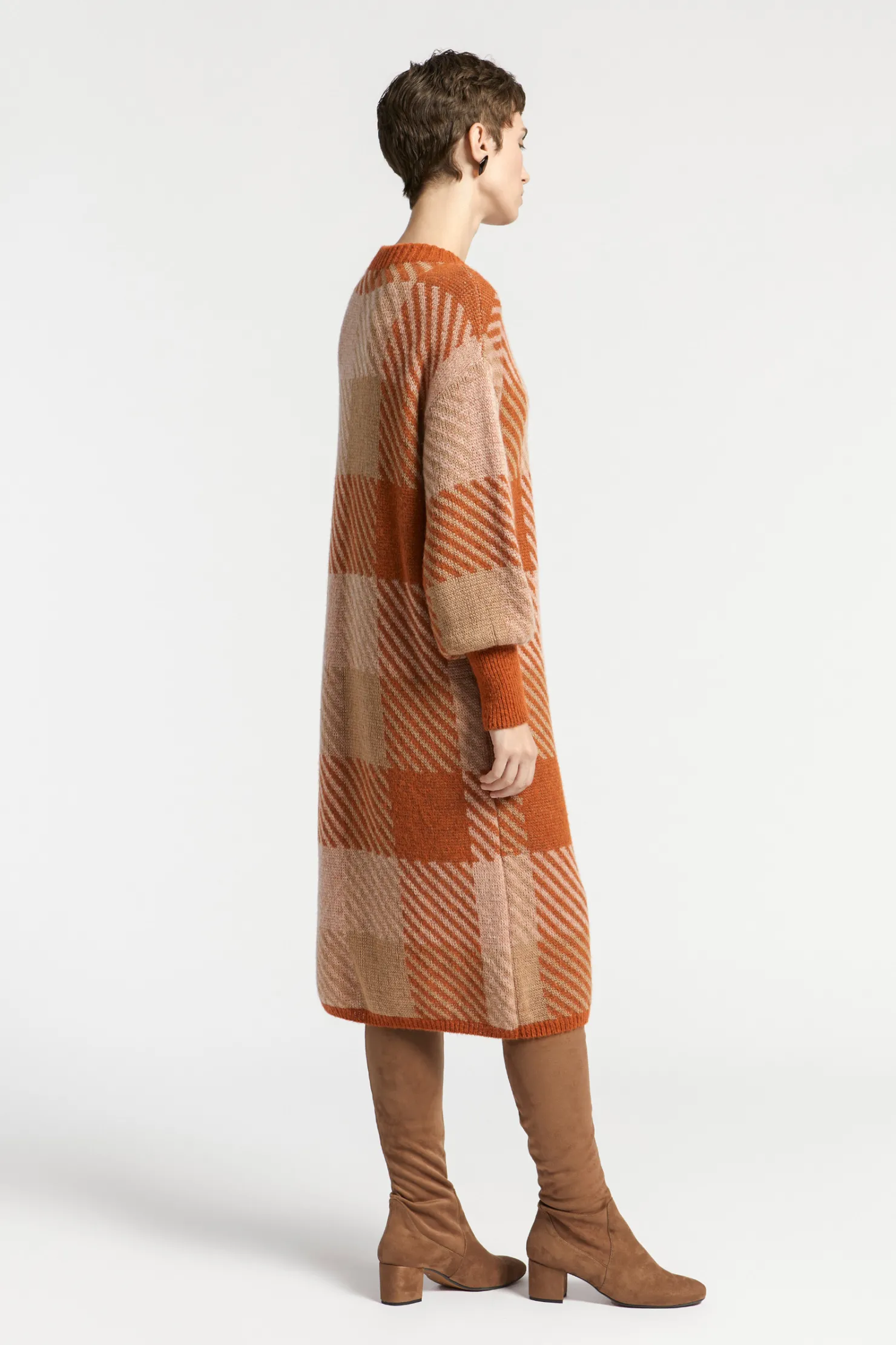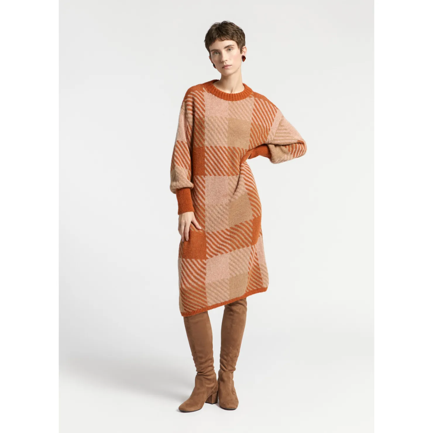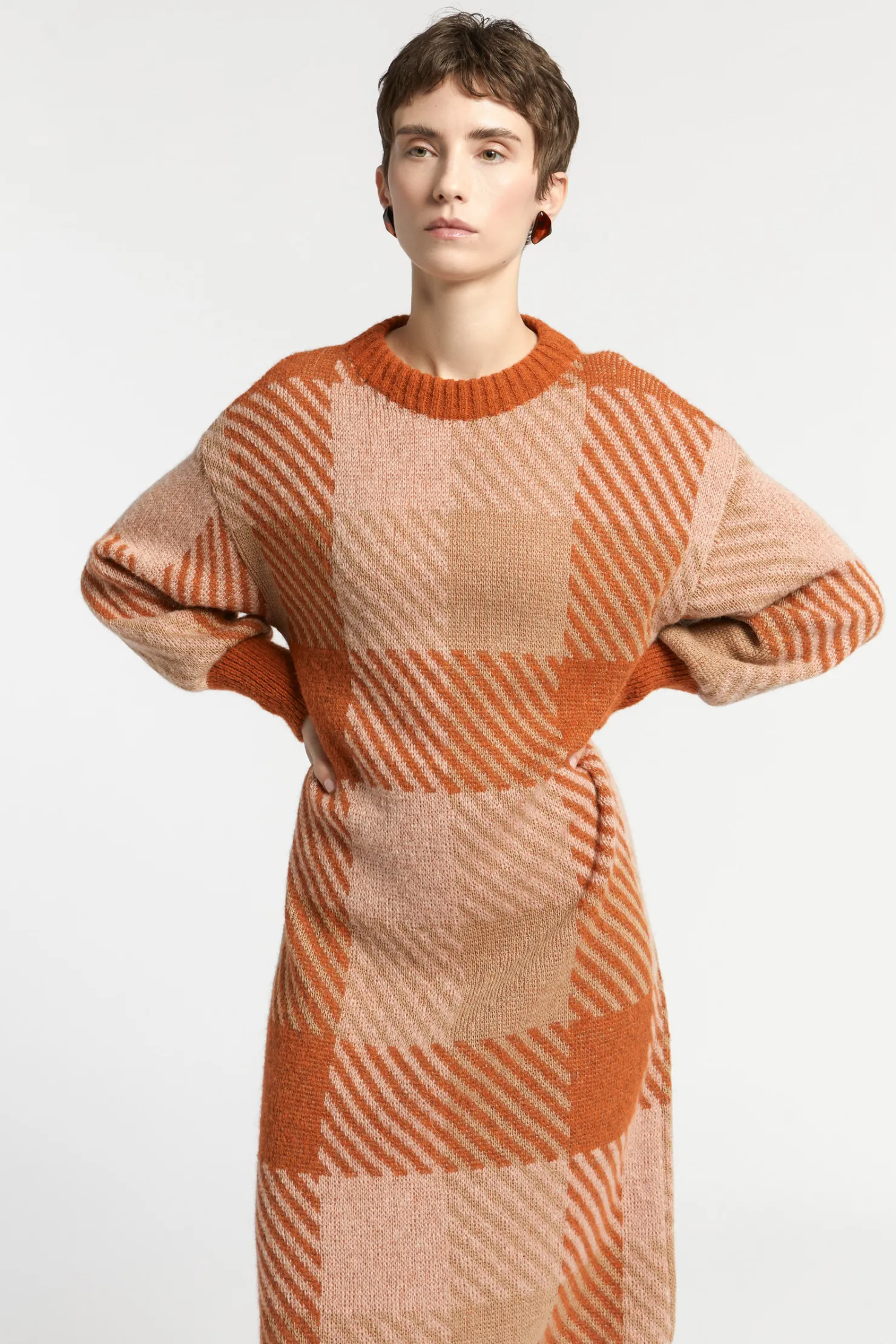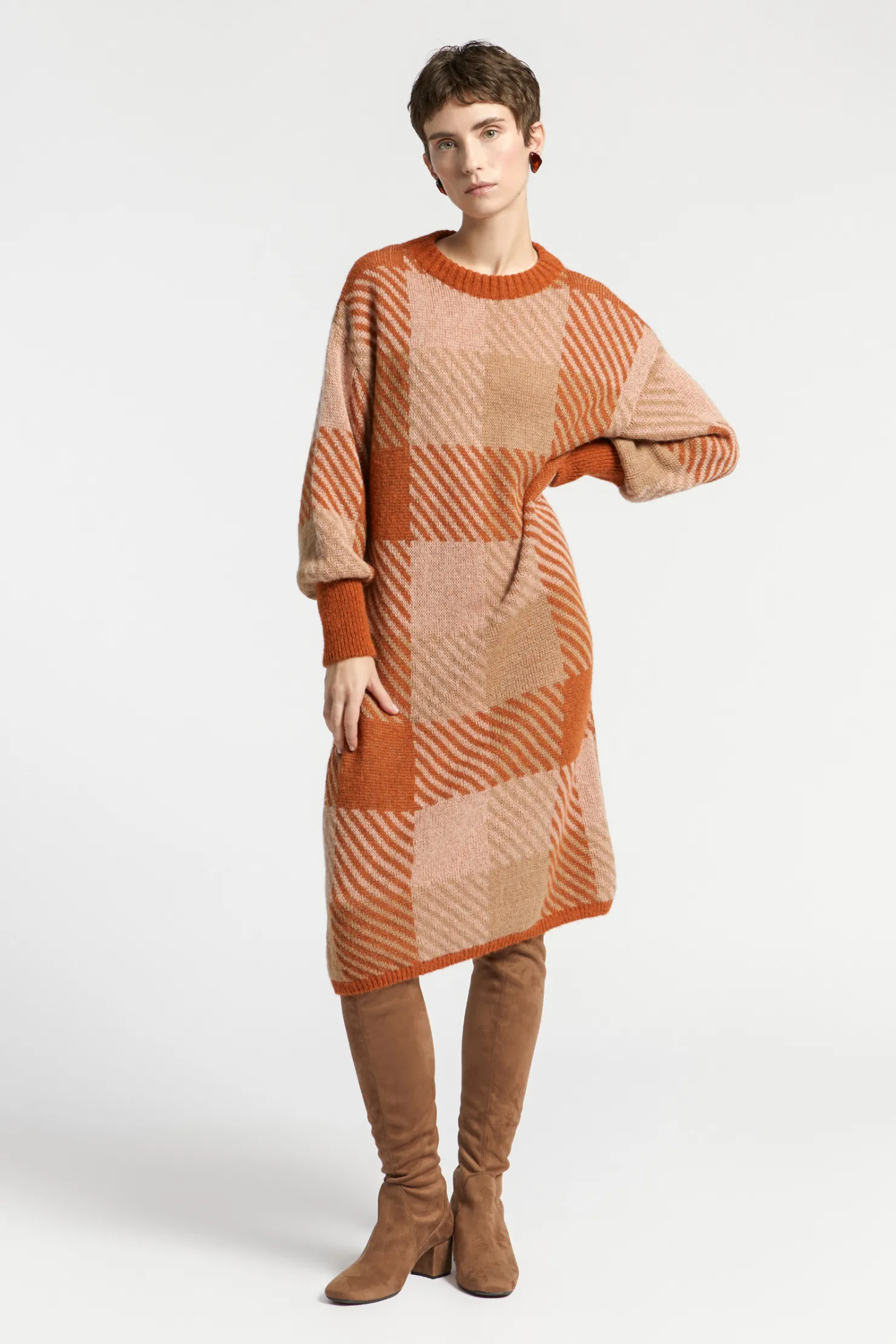 Rechte jurk met ronde hals Structuursteek van jacquard Tijdloze geruite print Middellange jurk
