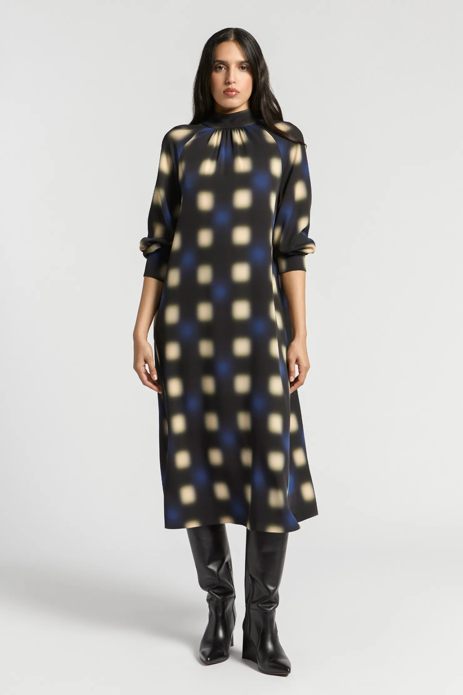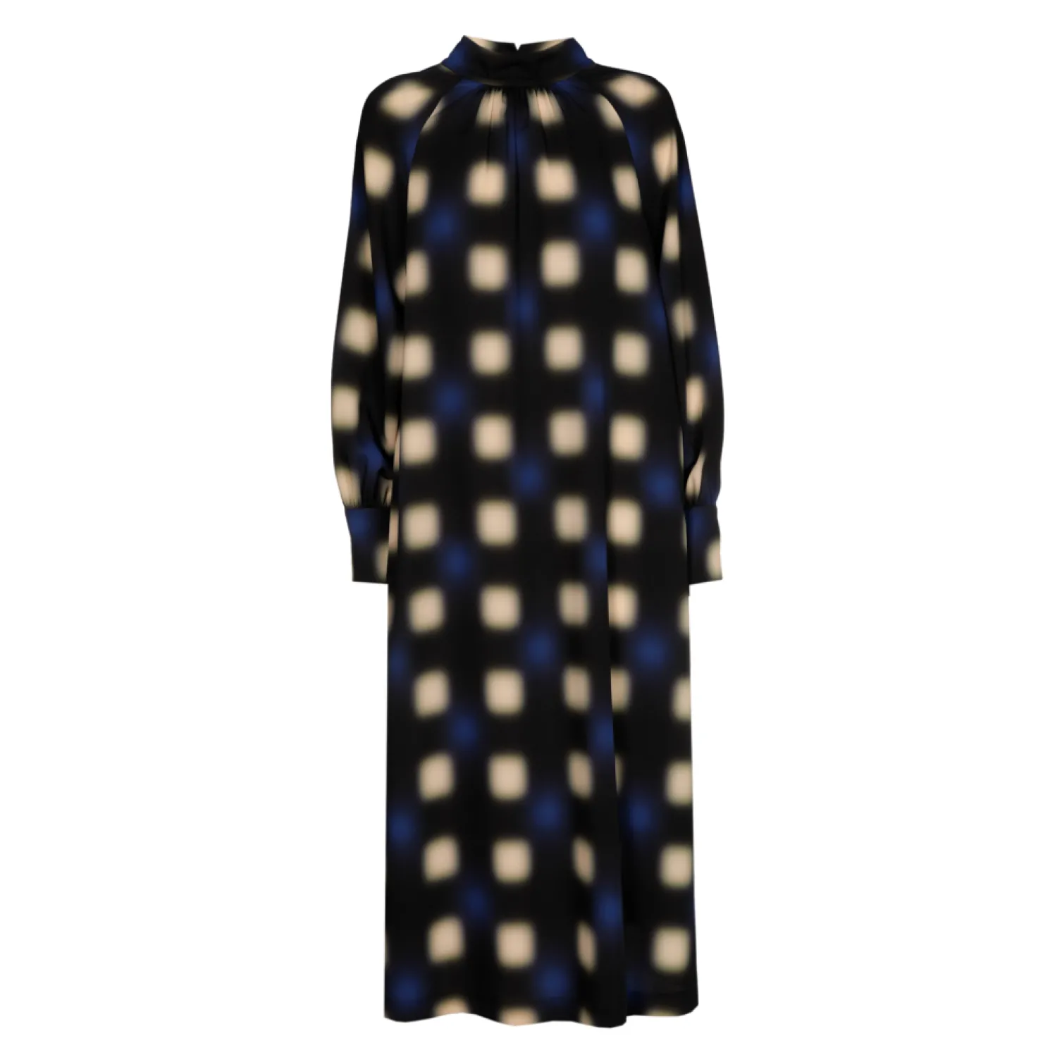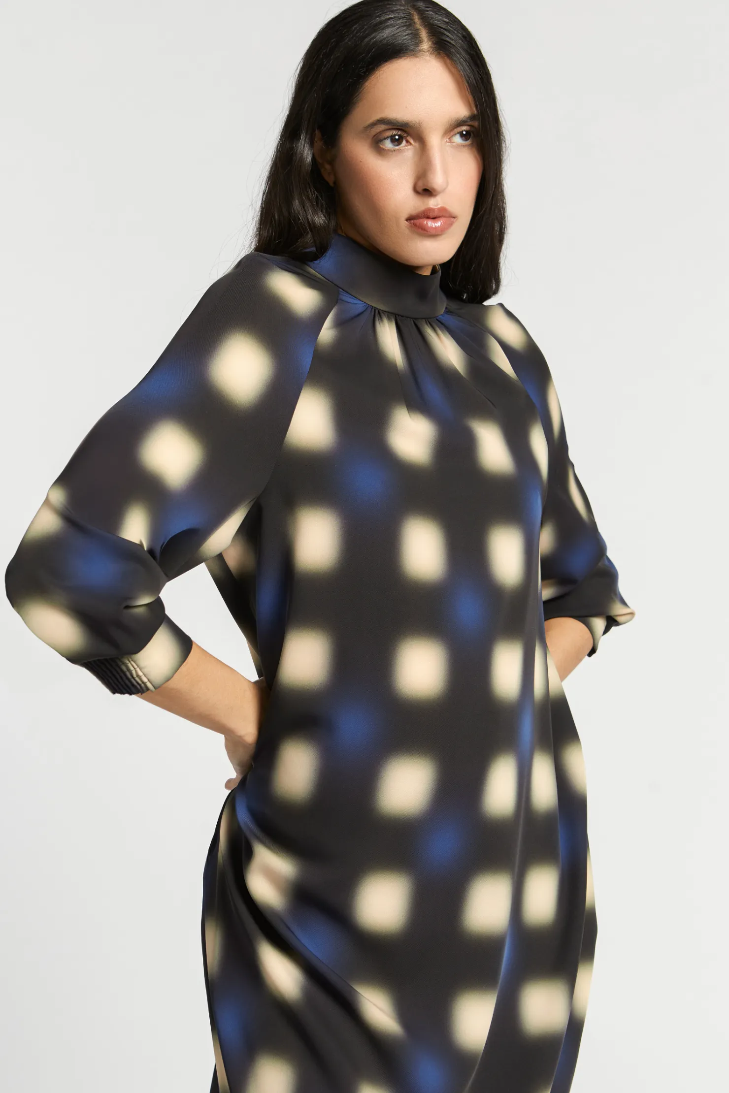 Opstaande kraag met fronsjes Raglanmouw met smockdetail Lang en wijd model Blurred dot print Fluïde stof