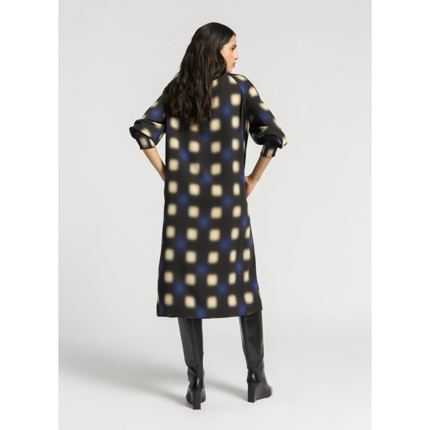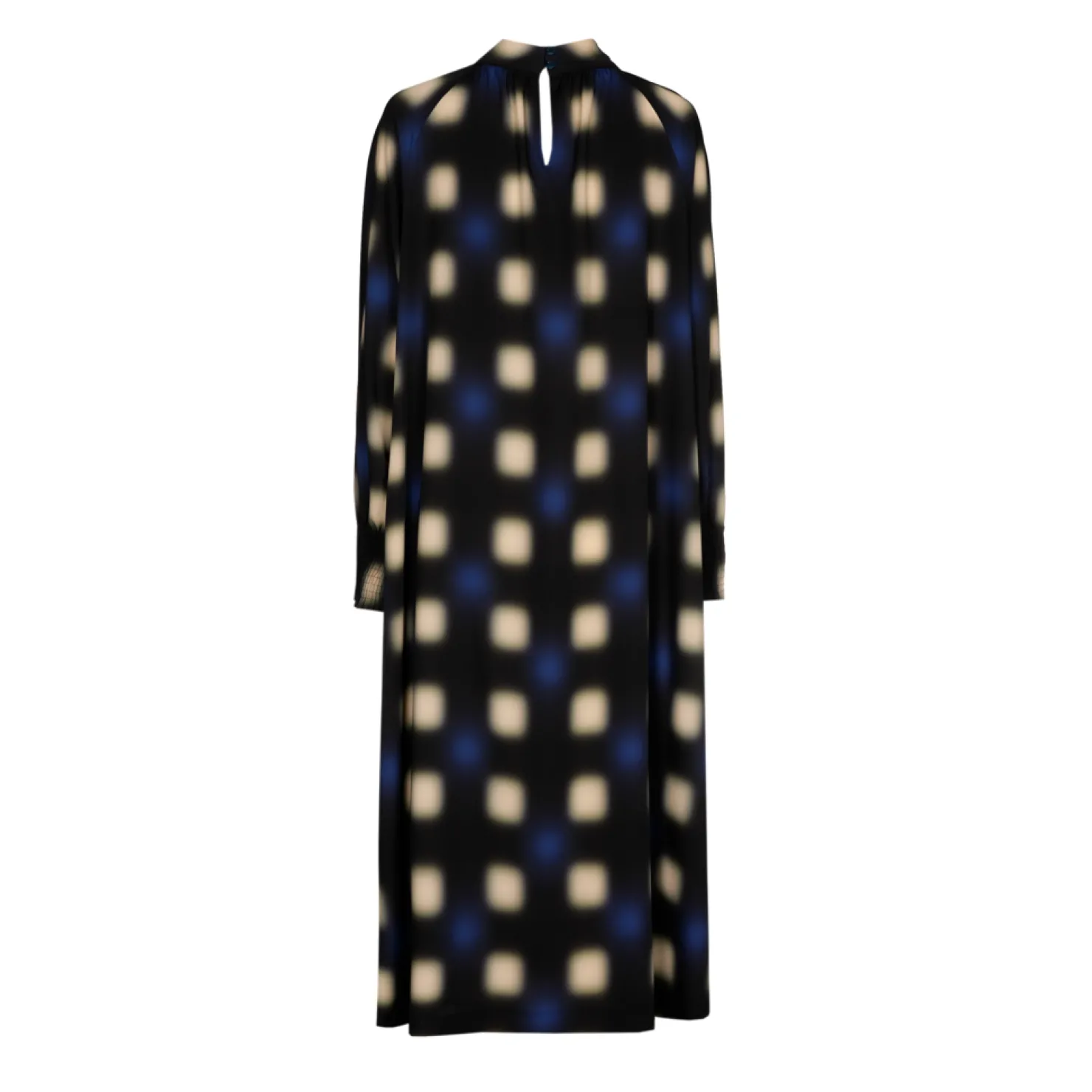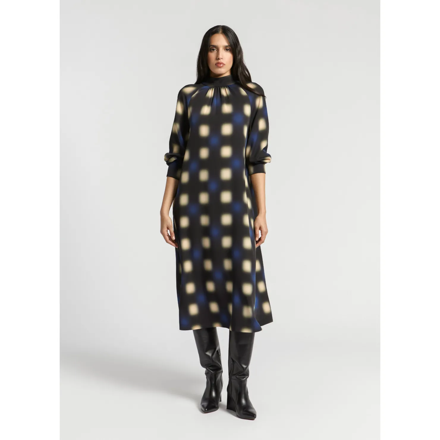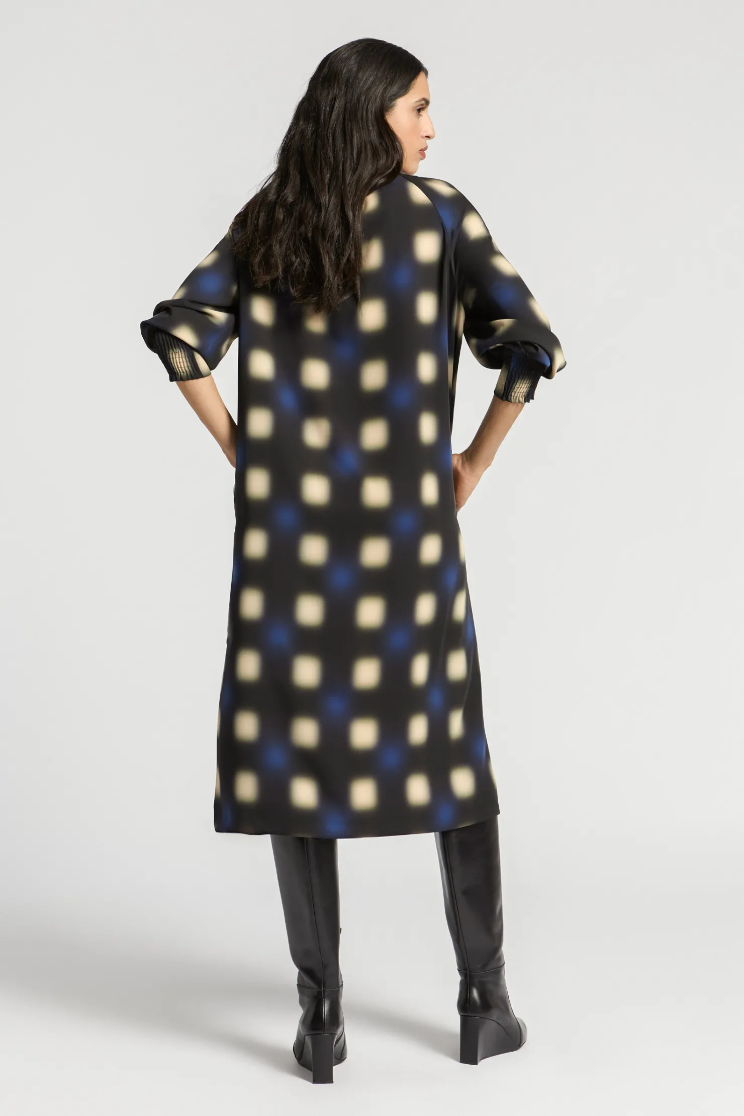 Opstaande kraag met fronsjes Raglanmouw met smockdetail Lang en wijd model Blurred dot print Fluïde stof