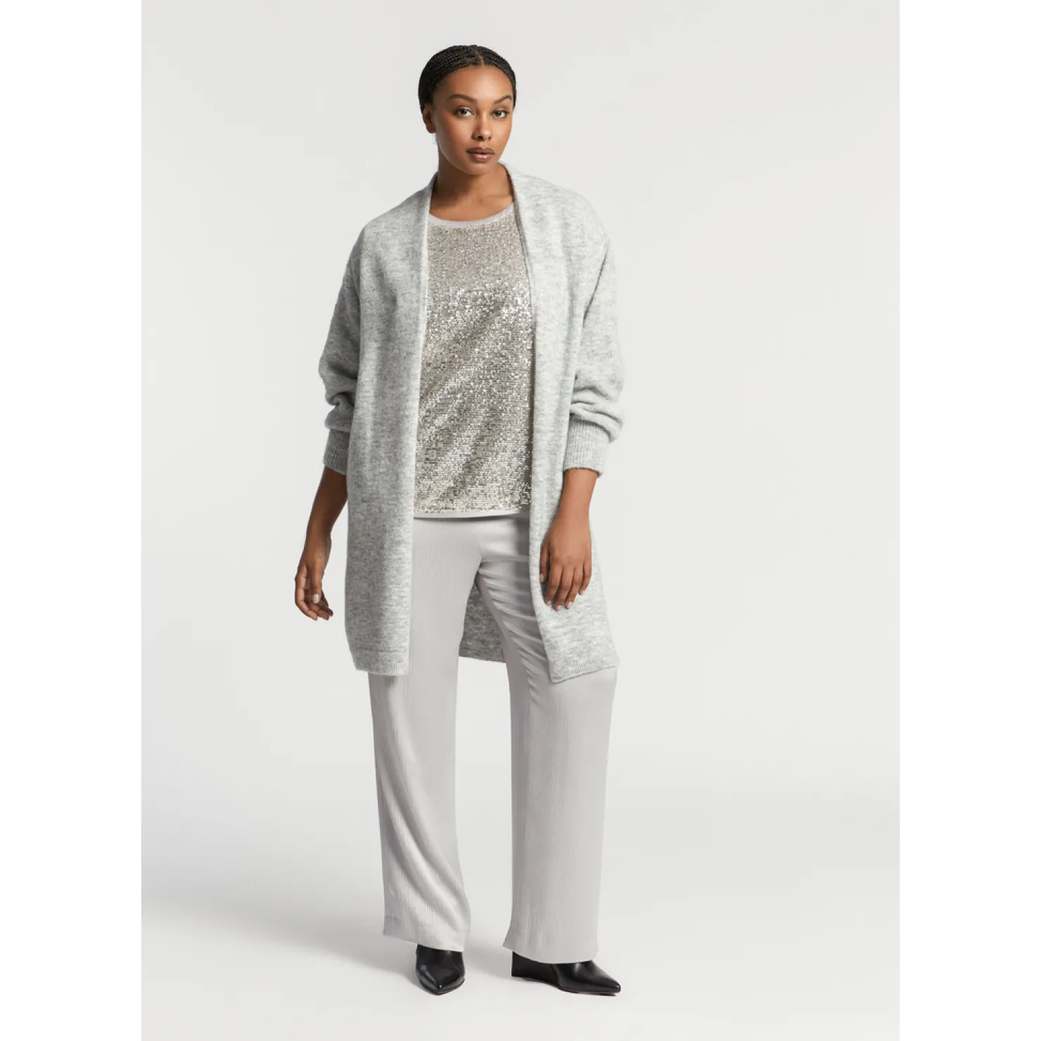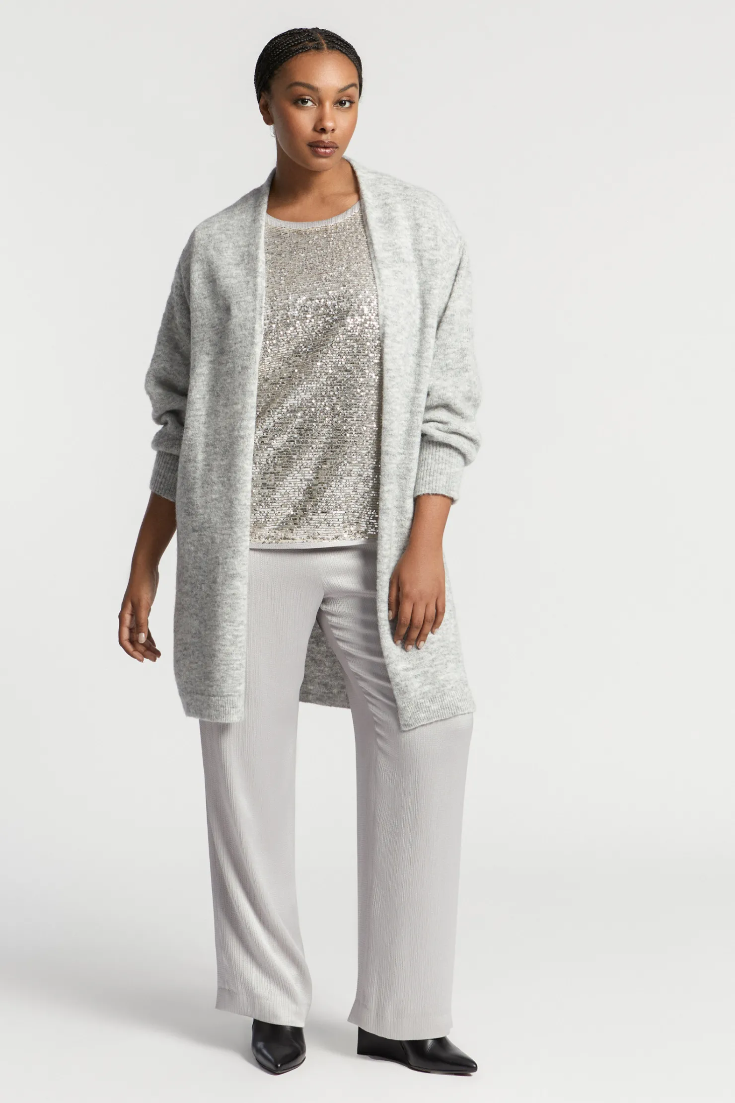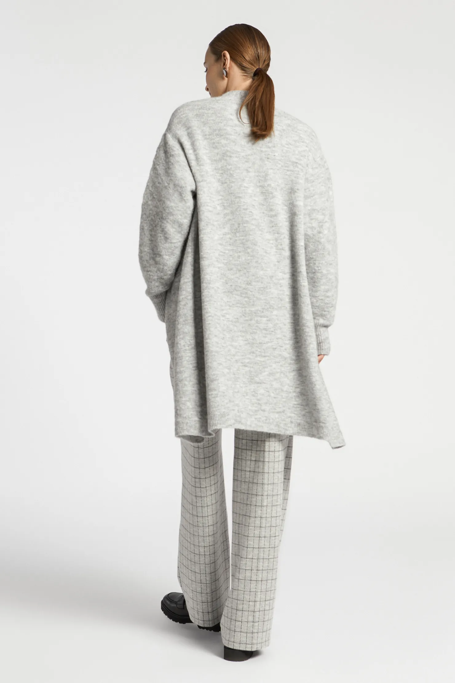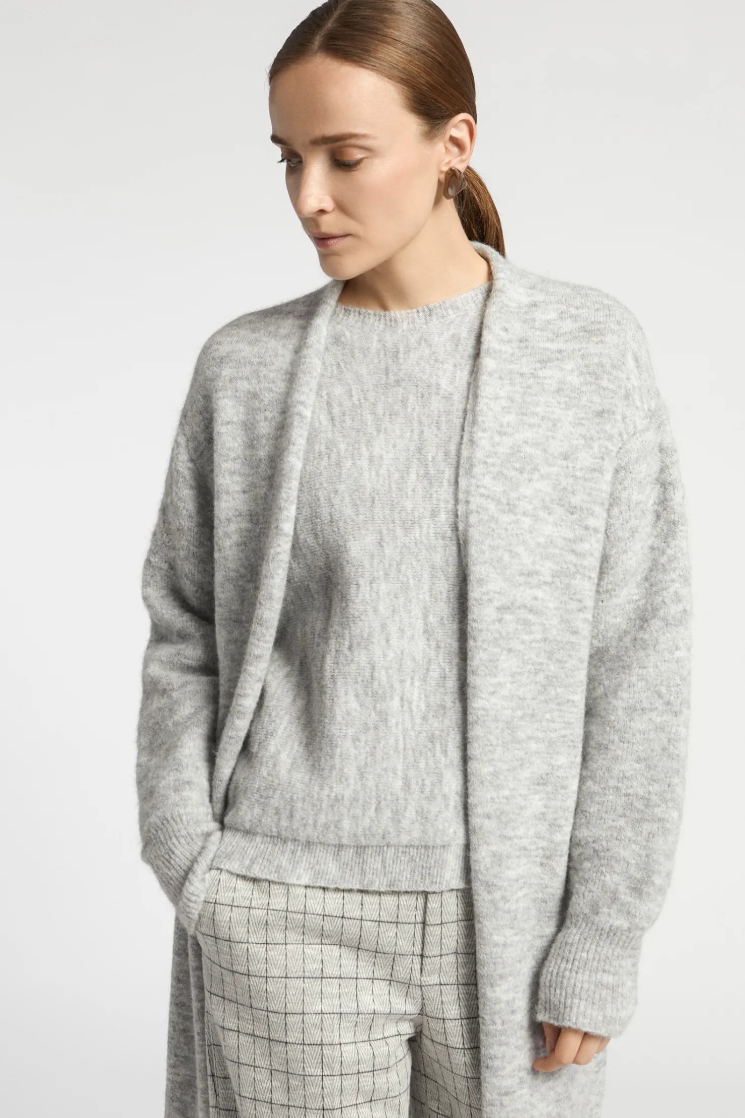 Wolmix met alpaca Lang model zonder sluiting Fantasiesteek op de mouwen Geribde boorden Wijde mouwen