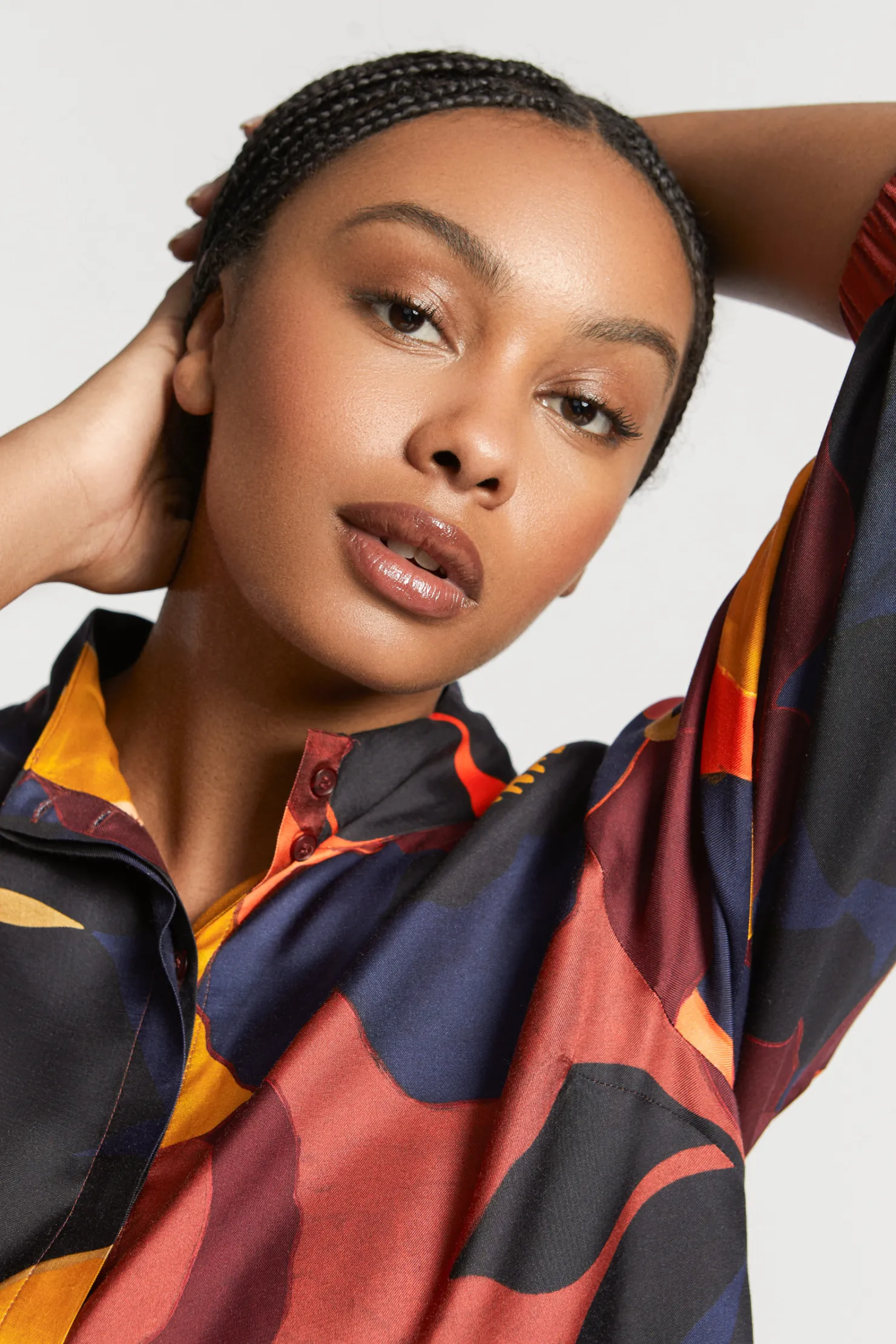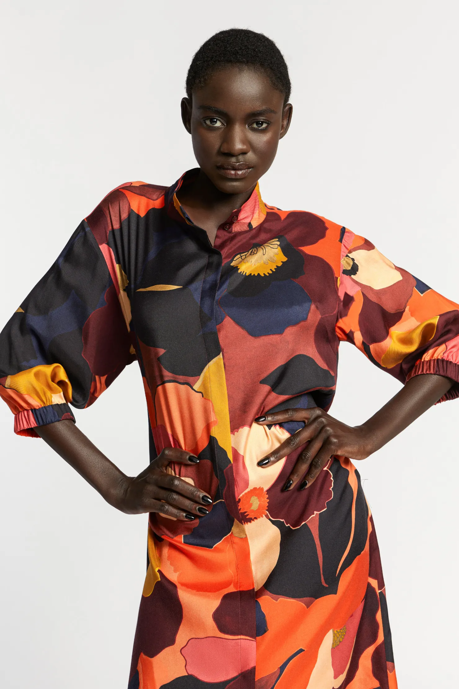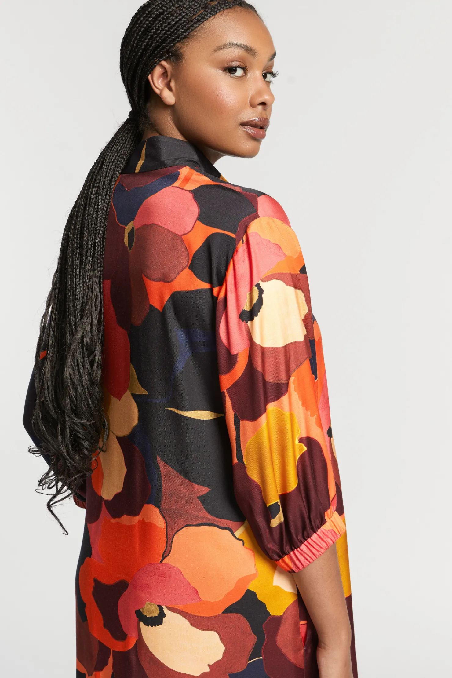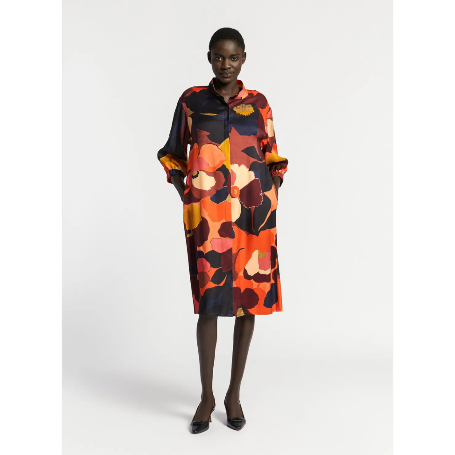 Opstaand kraagje Blinde sluiting met knopen Wijde mouwen met elastiek Borstneepje