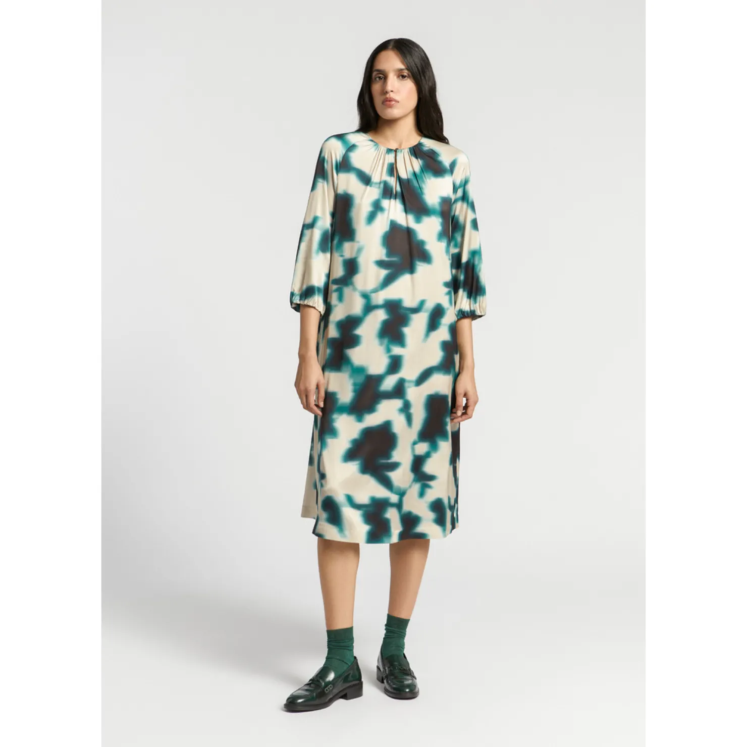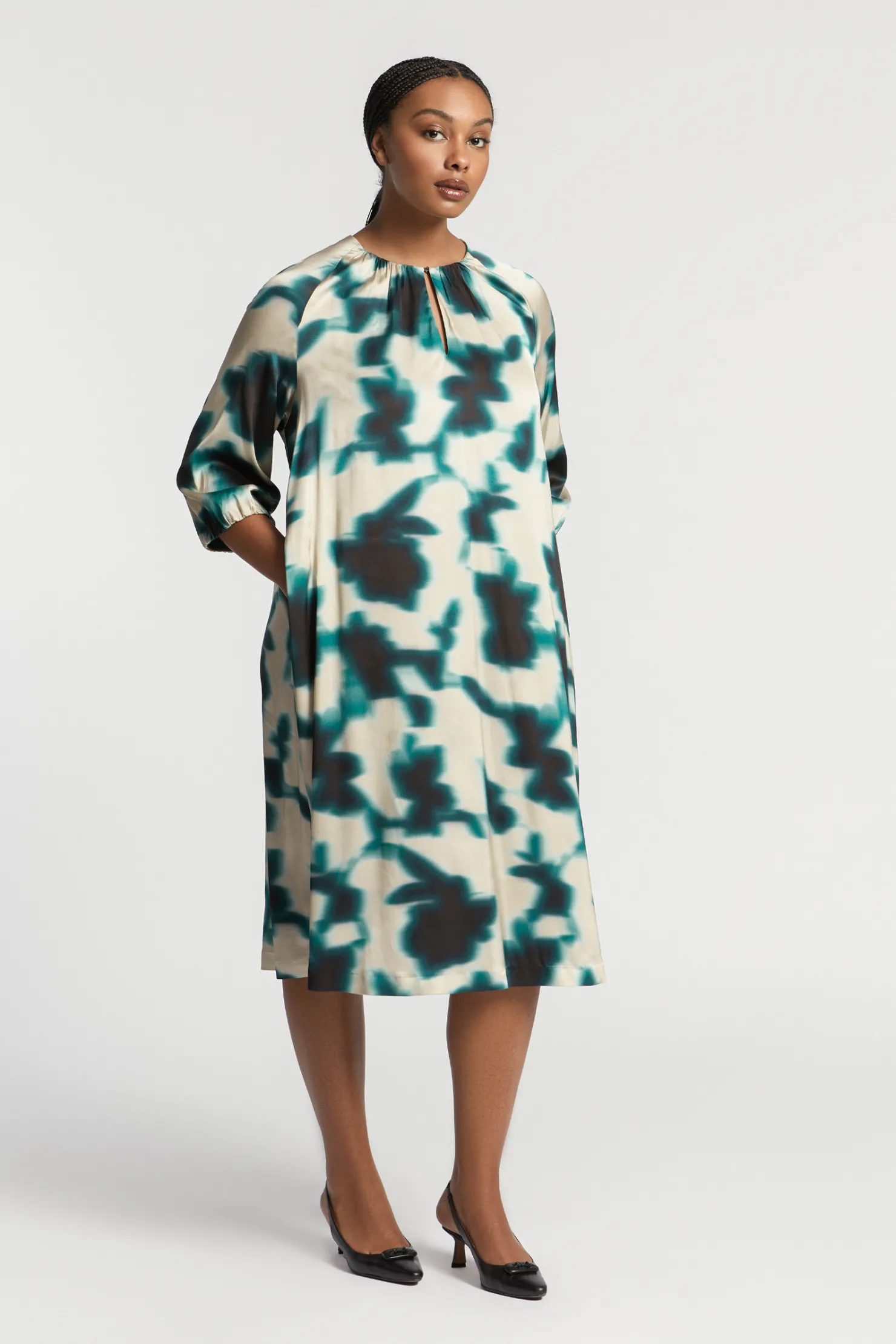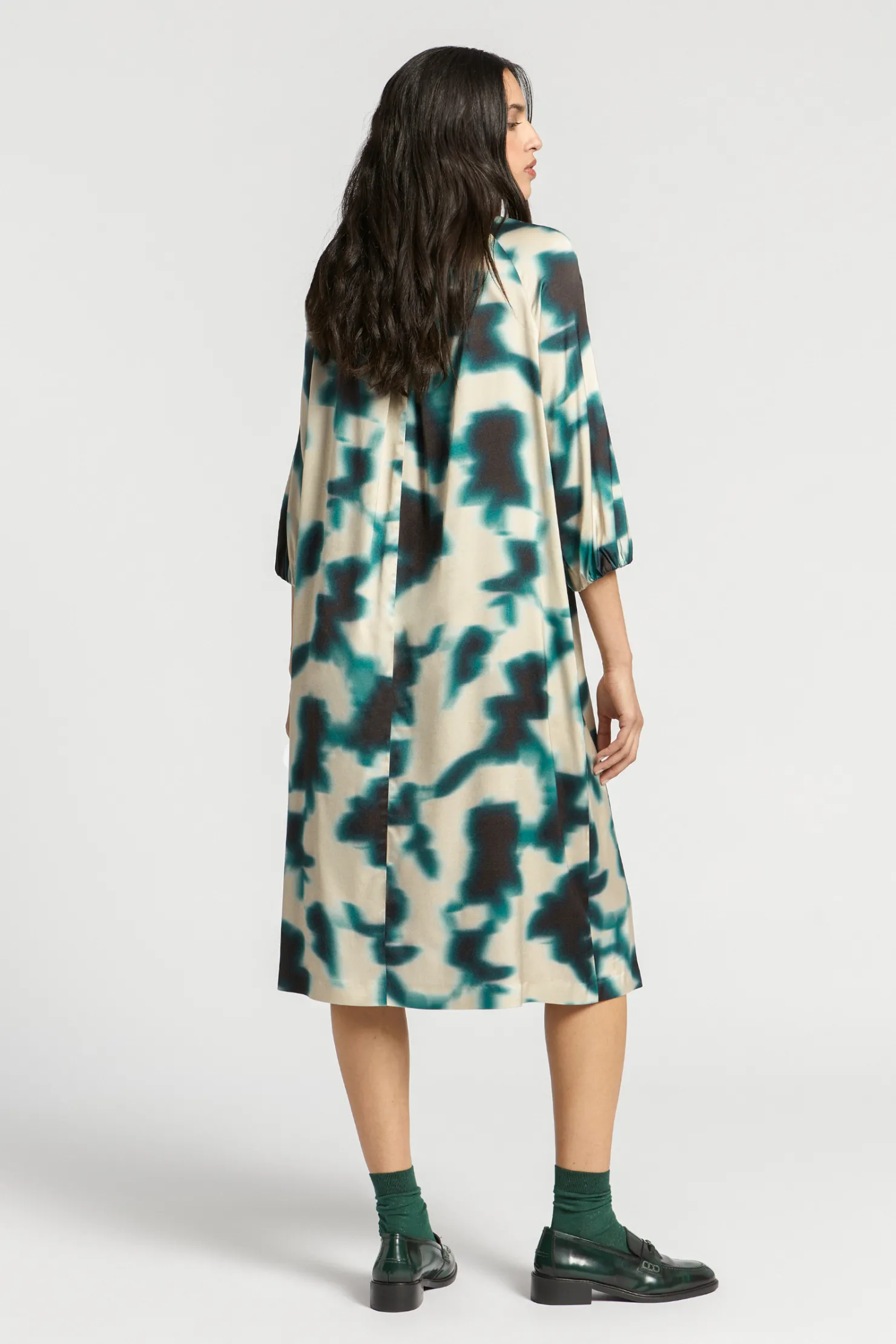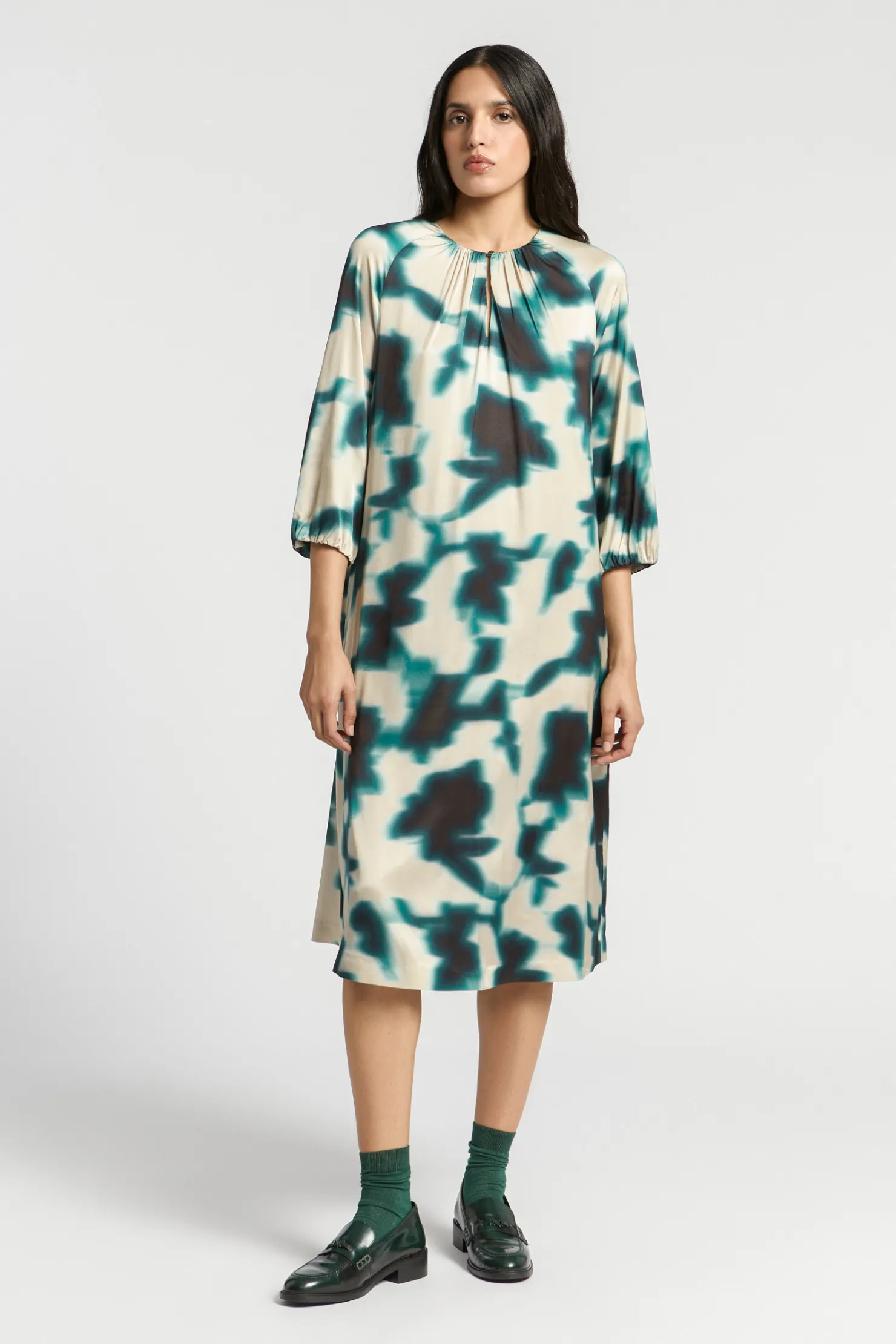 Middellange jurk met raglanmouw Ronde hals met knoopje Fluïde stof met losse pasvorm Pofmouw met frons aan cuff