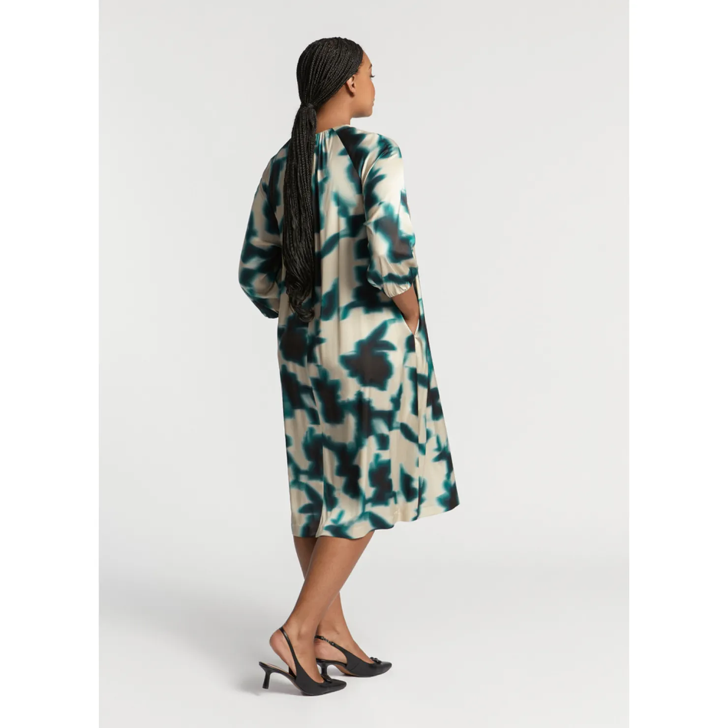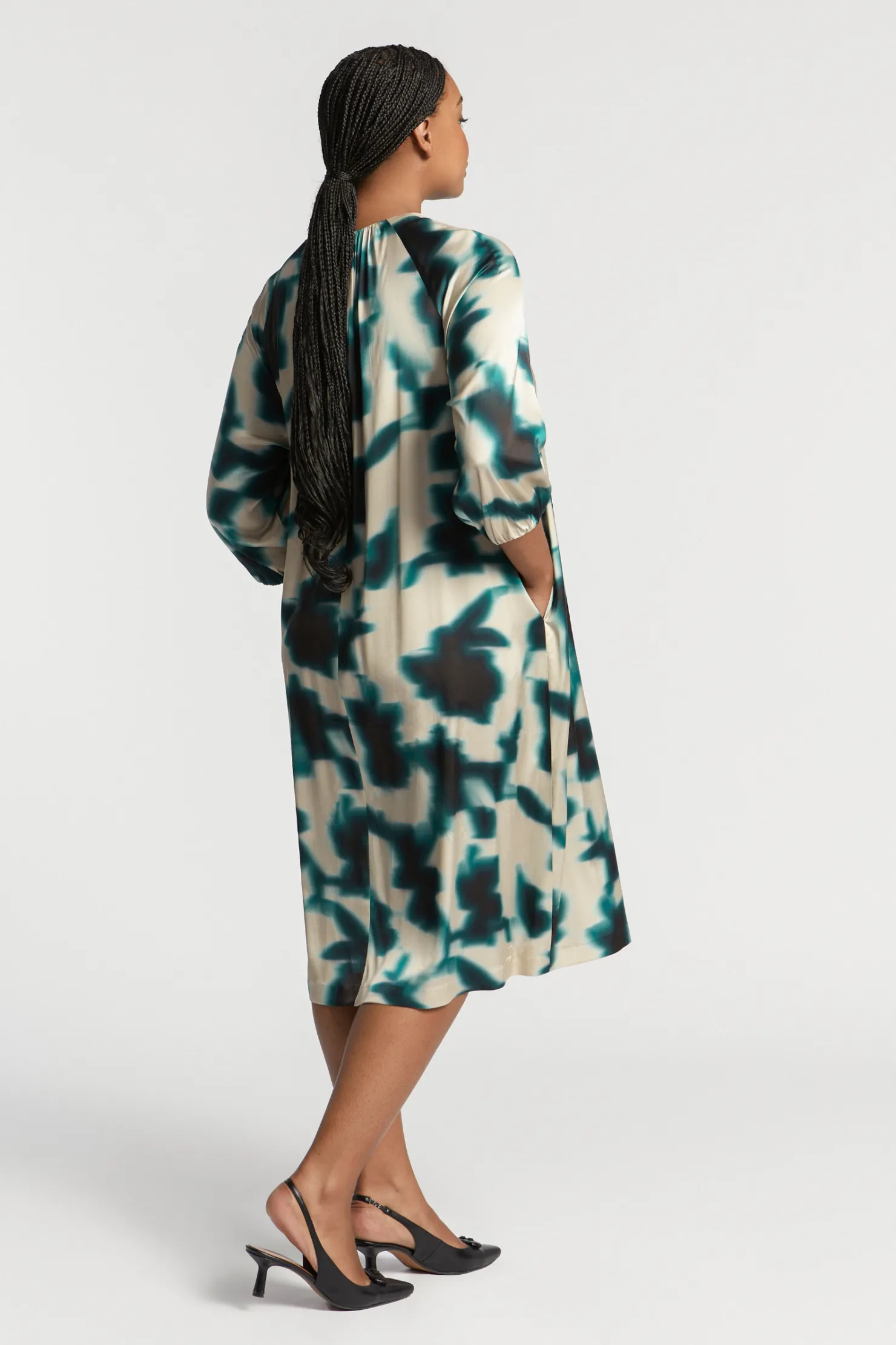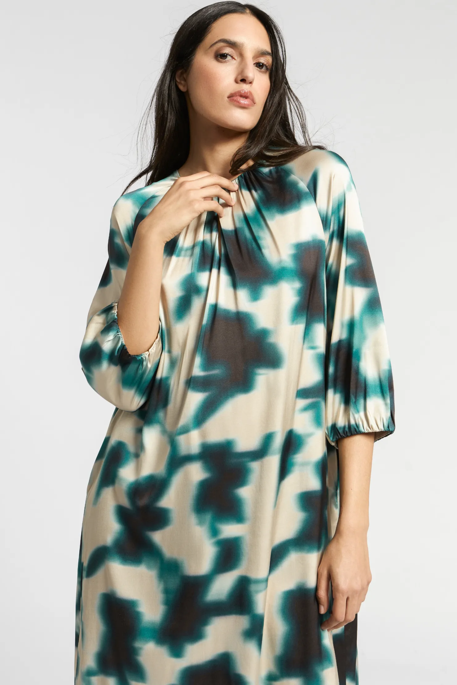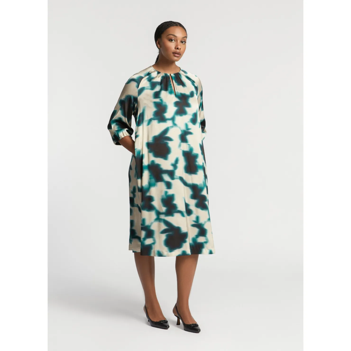 Middellange jurk met raglanmouw Ronde hals met knoopje Fluïde stof met losse pasvorm Pofmouw met frons aan cuff