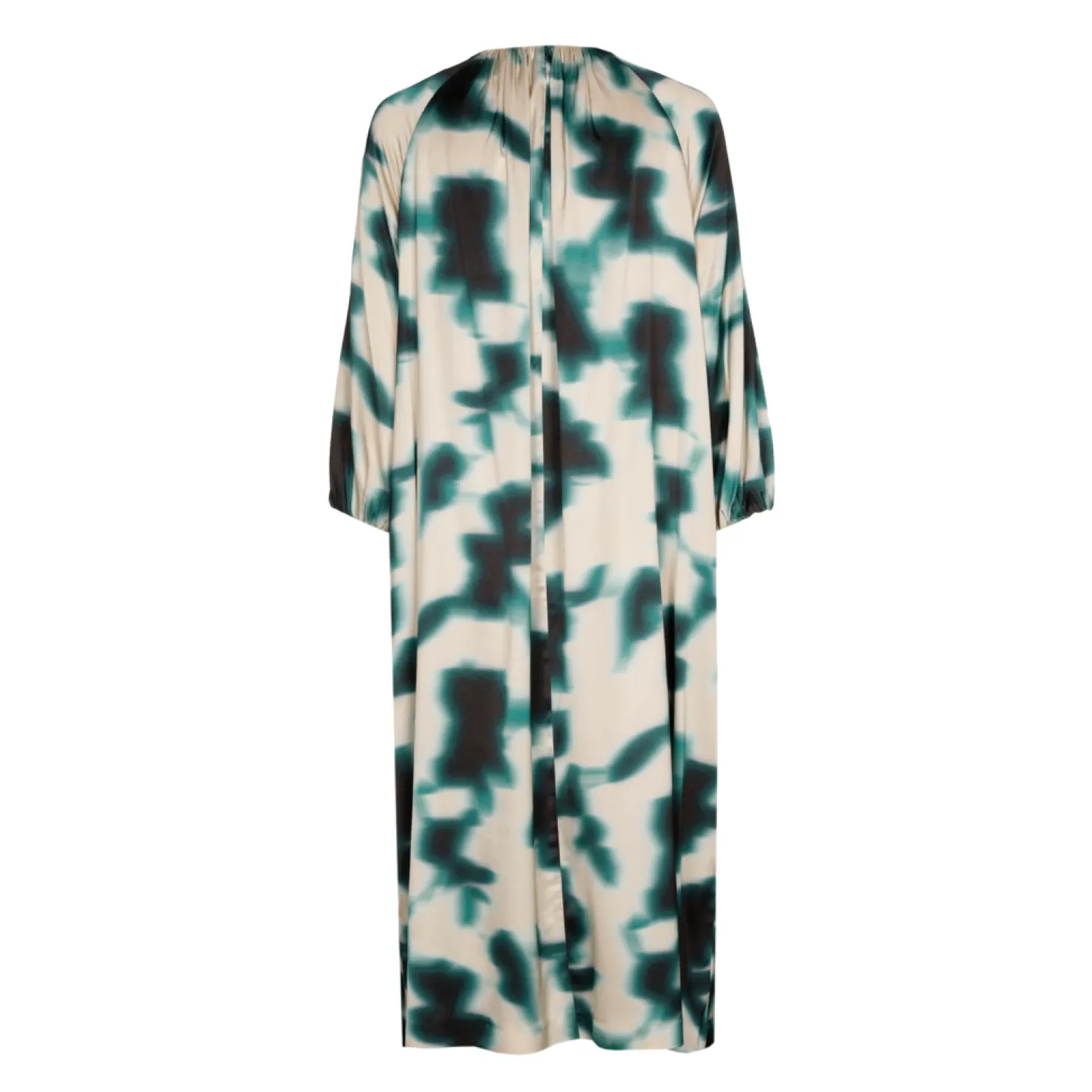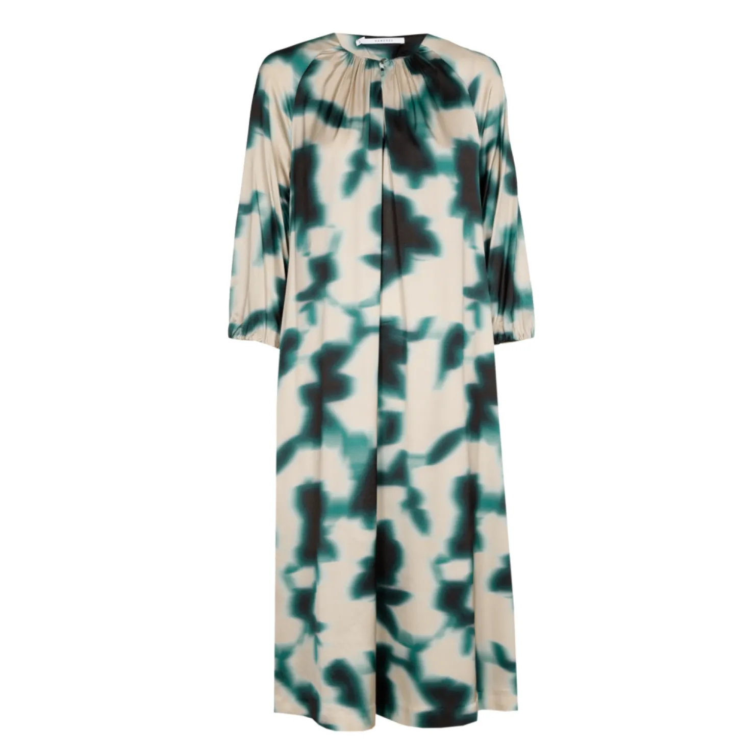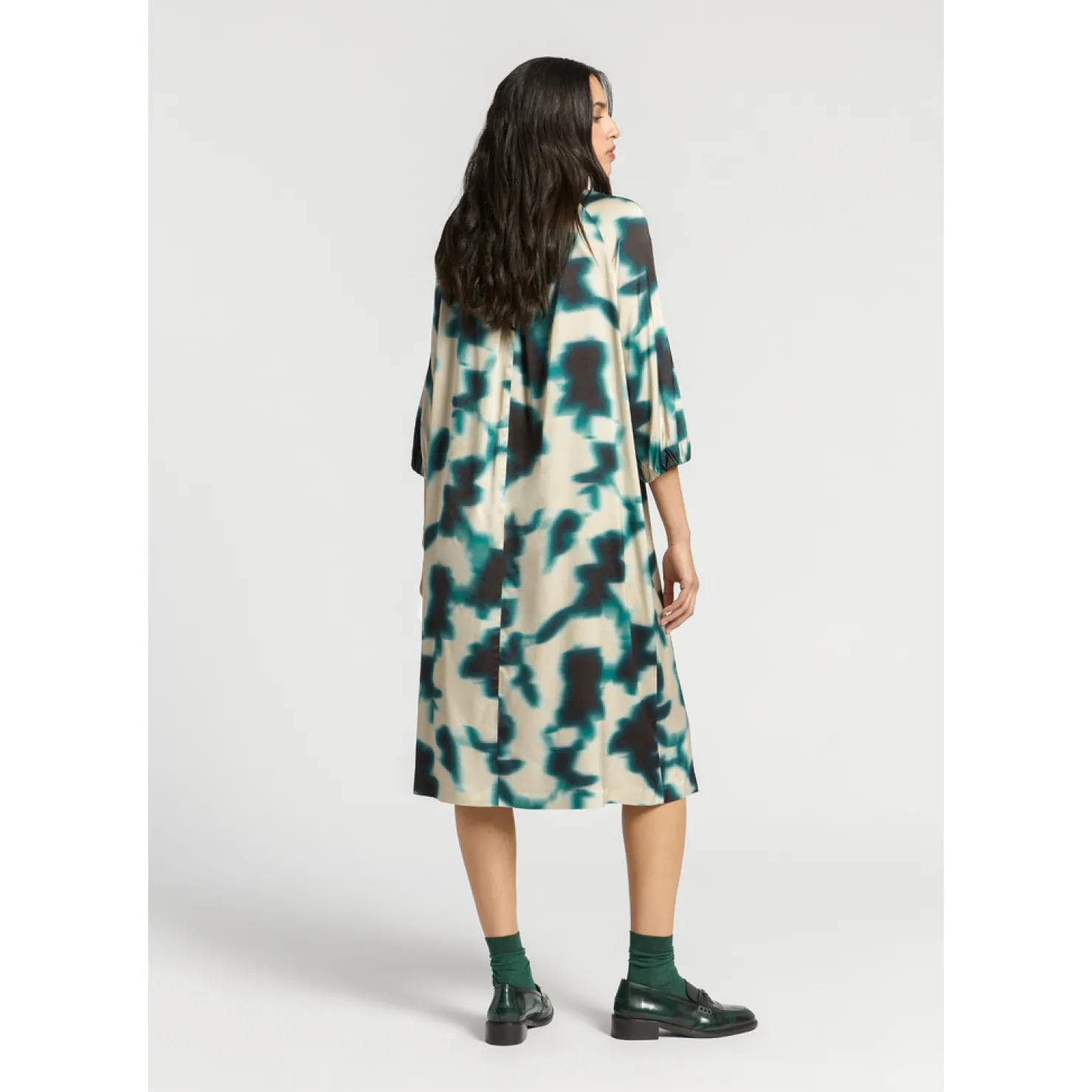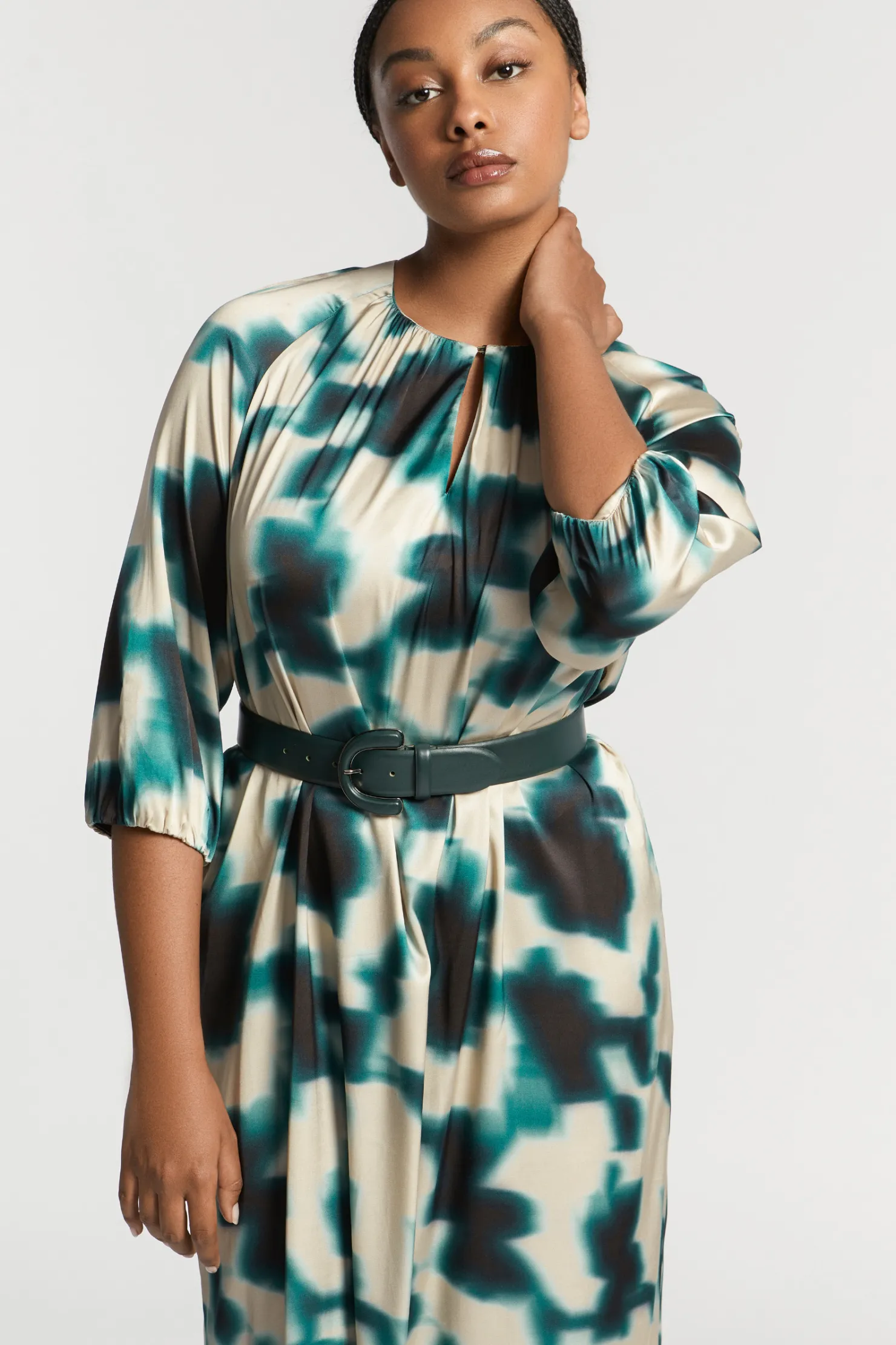 Middellange jurk met raglanmouw Ronde hals met knoopje Fluïde stof met losse pasvorm Pofmouw met frons aan cuff