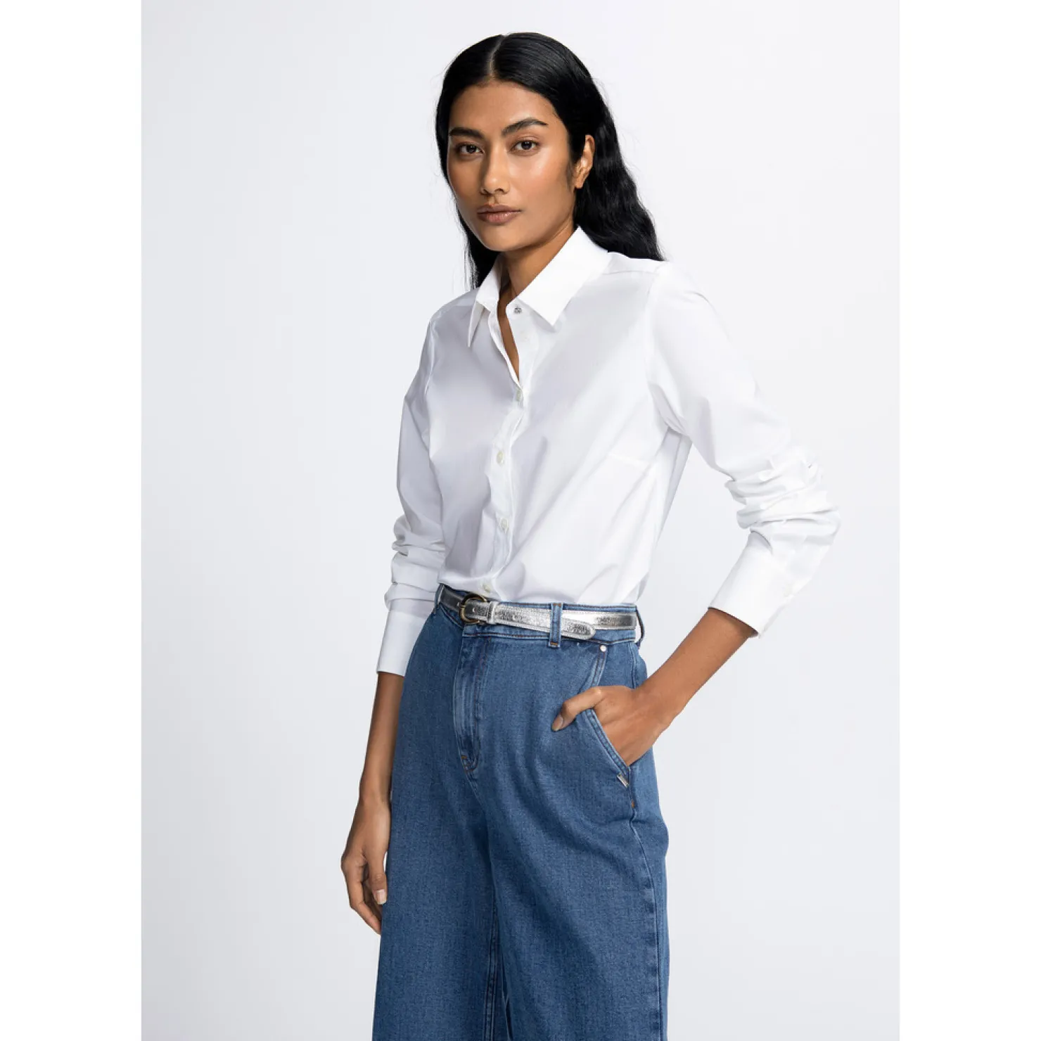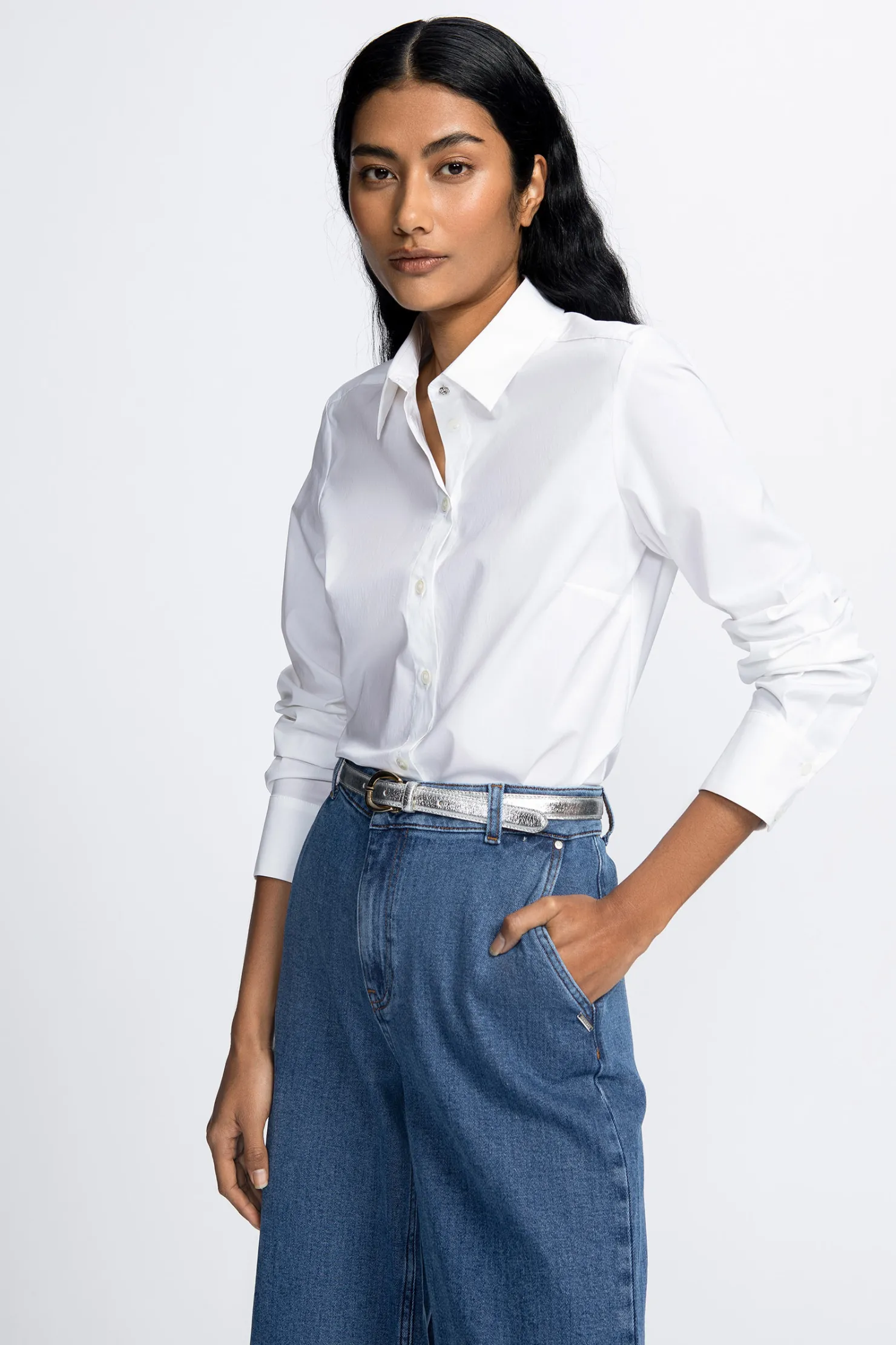 Tijdloze, gecentreerde blouse met knopen en lange mouwen. In een witte katoenen stretchstof.